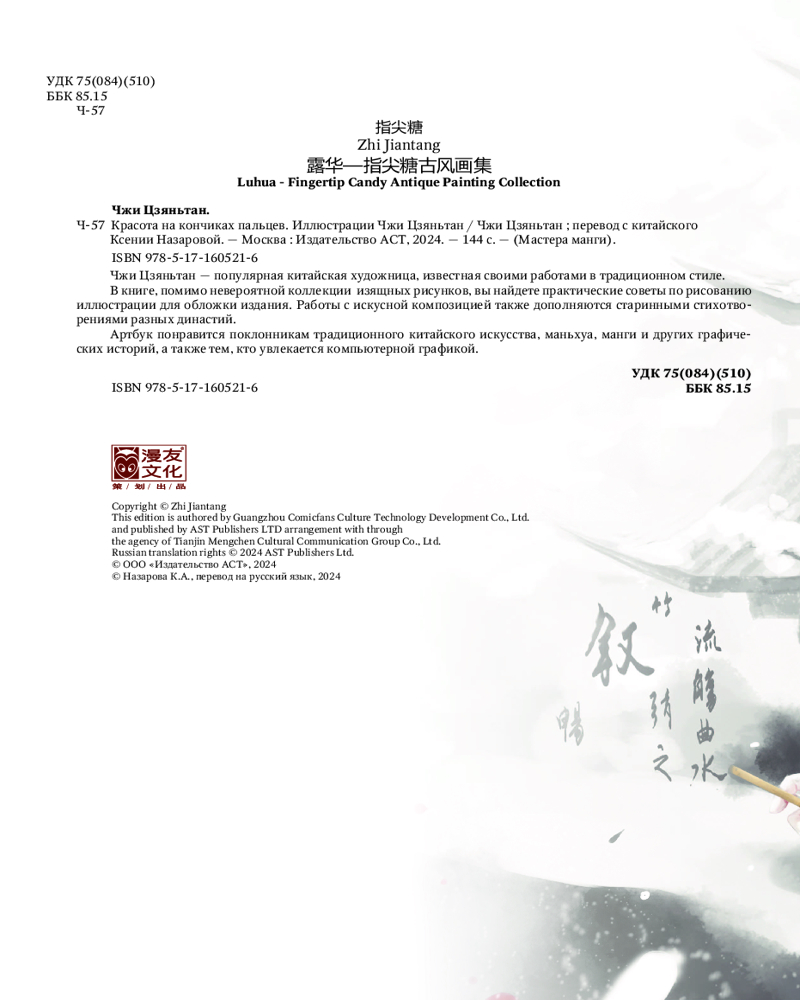 💳 Оплатить за товар можно при получении 🇰🇿 Есть бесплатная доставка по Казахстану от 1 дня 🎁 Копите бонусы с каждой покупки Серия: Мастера манги Чжи Цзяньтан — популярная китайская художница, известная своими работами в традиционном стиле. В книге, помимо невероятной коллекции изящных рисунков, вы найдете практические советы по рисованию иллюстрации для обложки издания. Работы с искусной композицией также дополняются старинными стихотворениями разных династий. Артбук понравится поклонникам традиционного китайского искусства, маньхуа, манги и других графических историй, а также тем, кто увлекается компьютерной графикой. |
