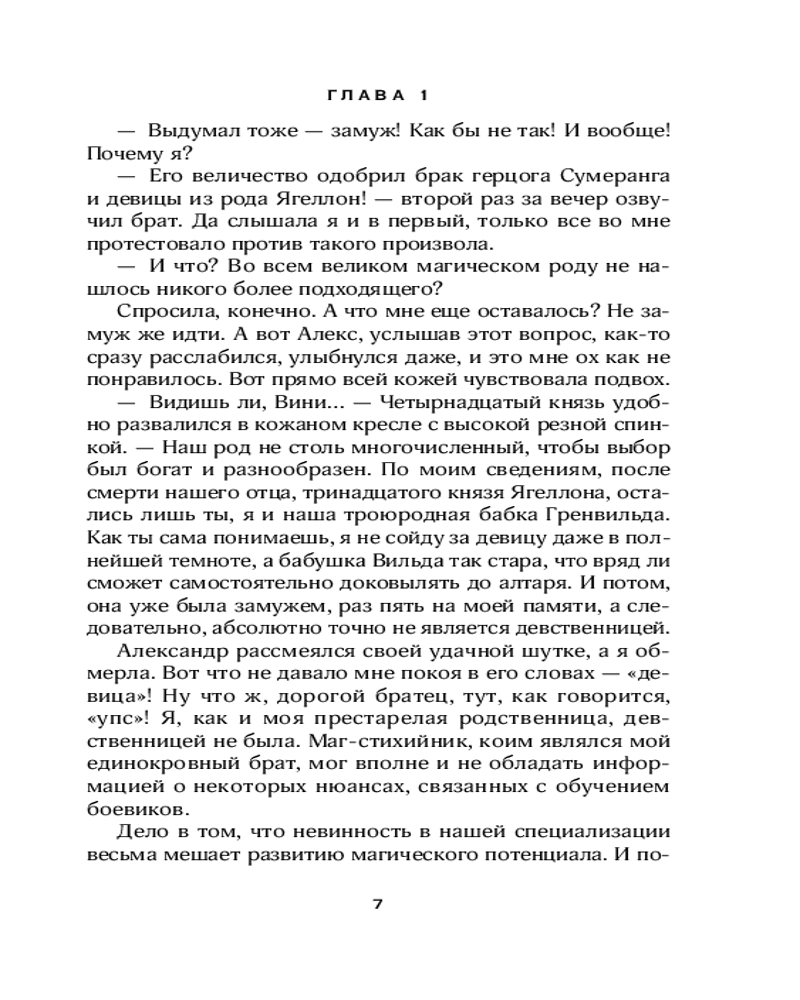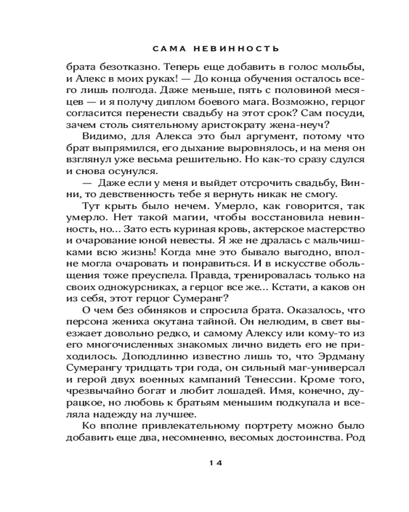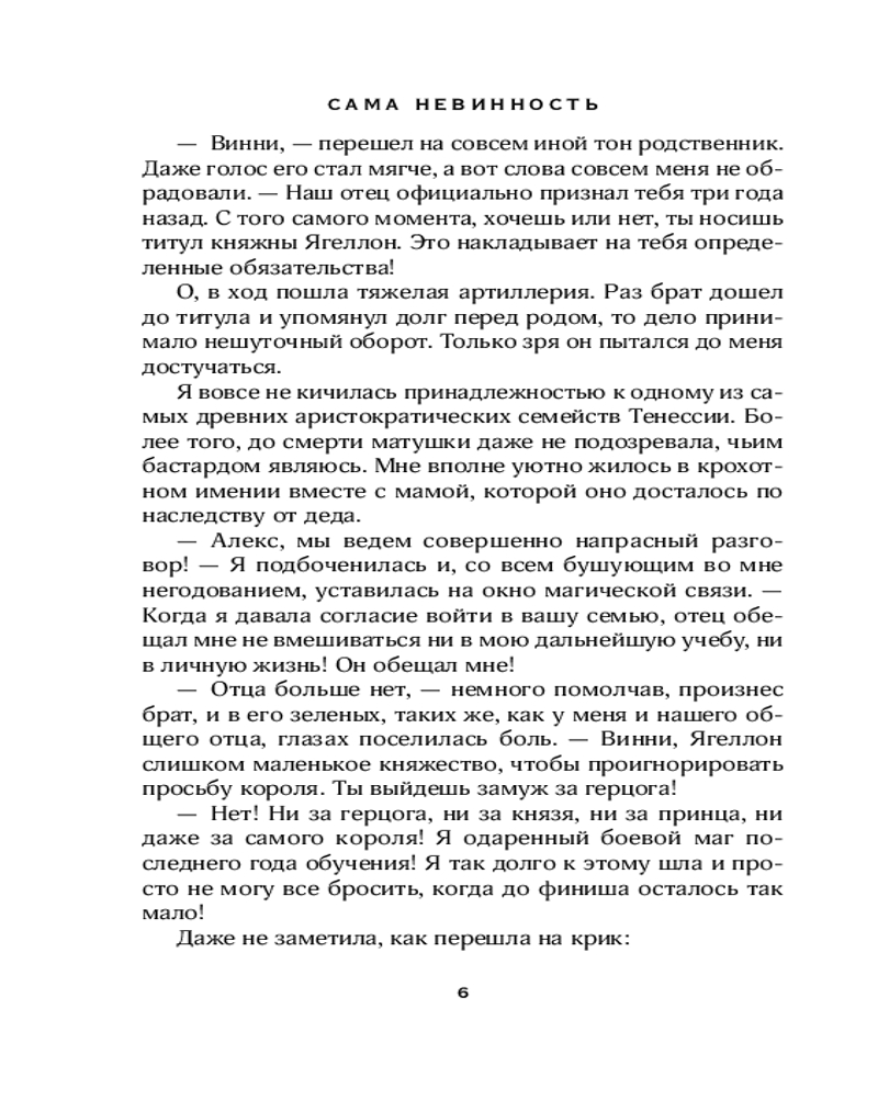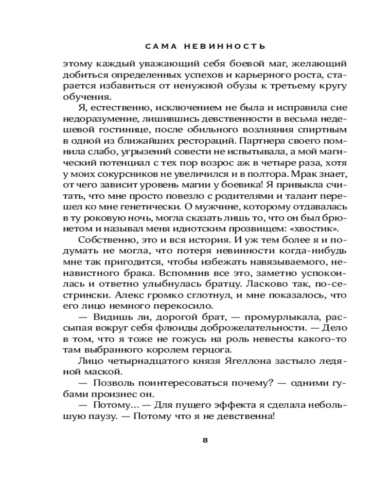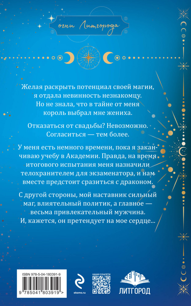 Сама невинностьВ данный момент этот товар отсутствует в продаже. Возможно, у нас найдется аналогичный или похожий товар здесь. Серия: Огни Литгорода. Лучшее романтическое фэнтези Желая раскрыть потенциал своей магии, я отдала невинность незнакомцу. Но не знала, что втайне от меня король выбрал мне жениха. Отказаться от свадьбы? Невозможно. Согласиться — тем более. У меня есть немного времени, пока я заканчиваю учебу в Академии. Правда, на время итогового испытания меня назначили телохранителем для экзаменатора, и нам вместе предстоит предстоит приручить дракона и сразиться с порождениями мрака. С другой стороны, мой наставник сильный маг, влиятельный политик, а главное — весьма привлекательный мужчина. И, кажется, он претендует на мое сердце... |