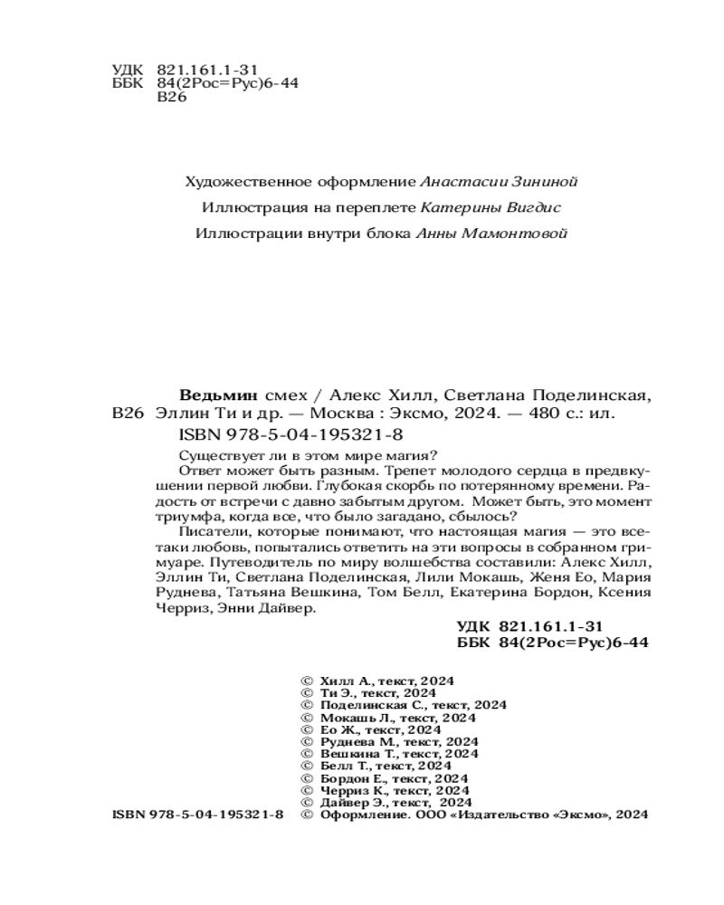 💳 Оплатить за товар можно при получении 🇰🇿 Есть бесплатная доставка по Казахстану от 1 дня 🎁 Копите бонусы с каждой покупки Серия: Young Adult. Гримуар Вторая книга в серии раскроет тему ведьм и чародеев, показав многогранность феномена в глобальной культуре. В начале каждого рассказа будет мини-анкета, в которой автор делится своими мыслями о вечном. В сборник вошли: Алекс Хилл, Эллин Ти, Светлана Поделинская, Лили Мокашь, Женя Ео, Мария Руднева, Татьяна Вешкина, Том Белл, Екатерина Бордон, Ксения Черриз, Энни Дайвер. |