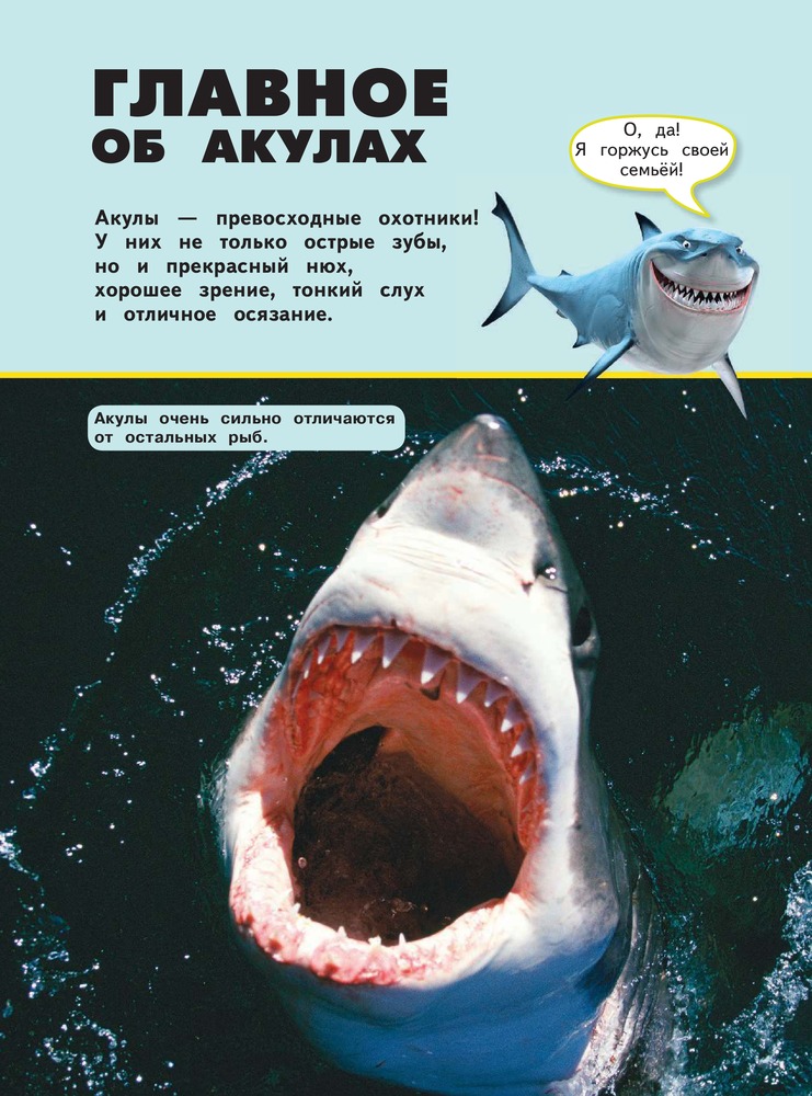 Очень интересная красочная книга. Страницы глянцевые. На каждой страницы по несколько фотографий, много из них крупным планом, иногда около изображены герои диснеевских мультфильмов. Фотографий больше, чем надписей. Книга предназначена для дошкольников и школьников младших классов. Информация охватывает только самое основное. Книга разделена на 6 тем. Акулы - все про них, динозавры, космос - отдельно про каждую планету солнечной системы и про освоение космоса, животные - где кто живет и про основных животных, земля и природа - про разные природные явления, такие как землетрясение и тд.