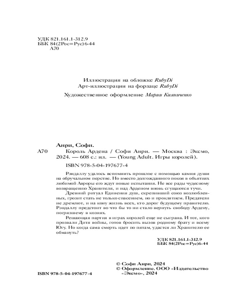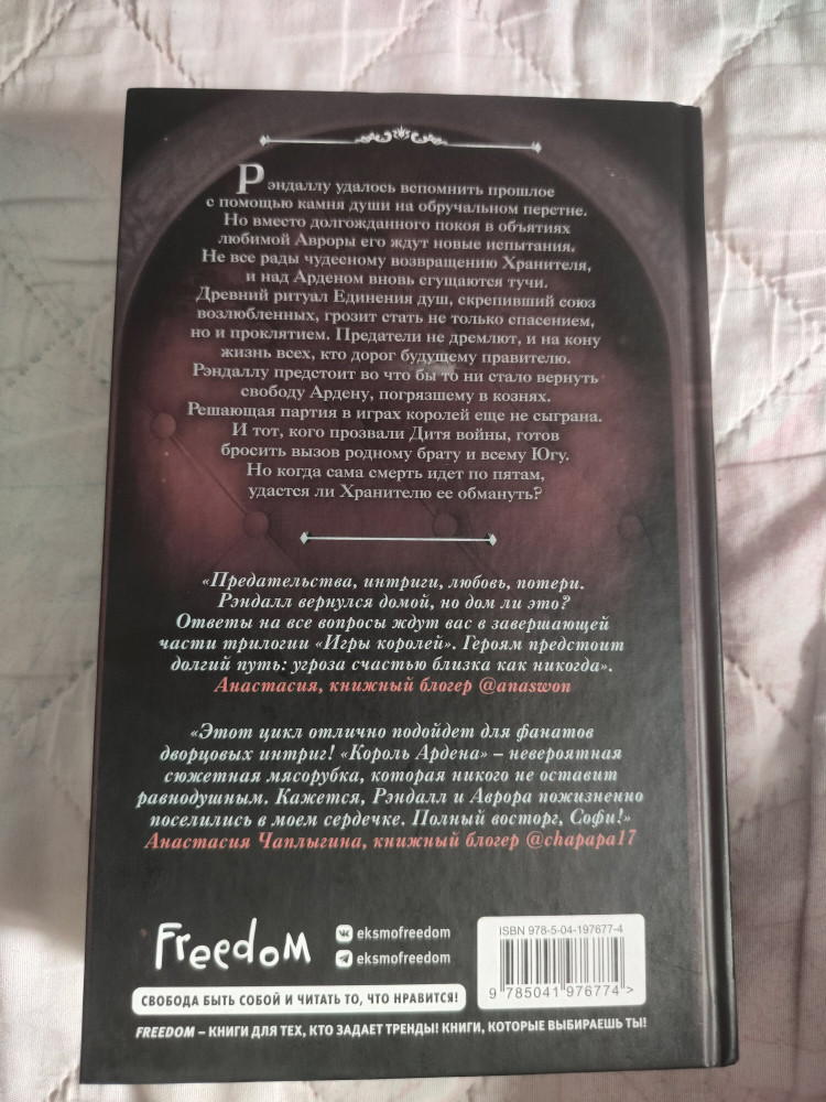 💳 Оплатить за товар можно при получении 🇰🇿 Есть бесплатная доставка по Казахстану от 1 дня 🎁 Копите бонусы с каждой покупки Серия: Young Adult. Игры королей Рэндаллу удалось вспомнить прошлое с помощью камня души на обручальном перстне. Но вместо долгожданного покоя в объятиях любимой Авроры его ждут новые испытания. Не все рады чудесному возвращению Хранителя, и над Арденом вновь сгущаются тучи. Древний ритуал Единения душ, скрепивший союз возлюбленных, грозит стать не только спасением, но и проклятием. Предатели не дремлют, и на кону жизнь всех, кто дорог будущему правителю. Рэндаллу предстоит во что бы то ни стало вернуть свободу Ардену, погрязшему в кознях. Решающая партия в играх королей еще не сыграна. И тот, кого прозвали Дитя войны, готов бросить вызов родному брату и всему Югу. Но когда сама смерть идет по пятам, удастся ли Хранителю ее обмануть? |