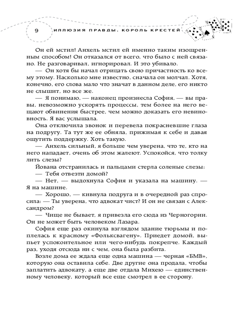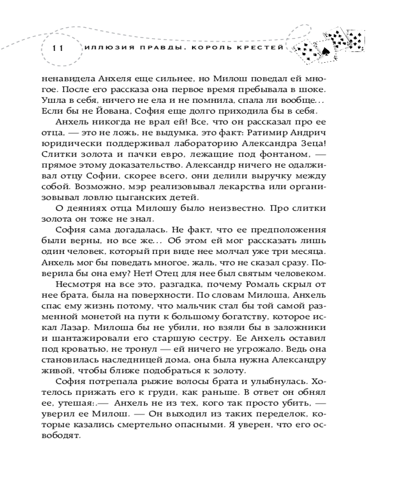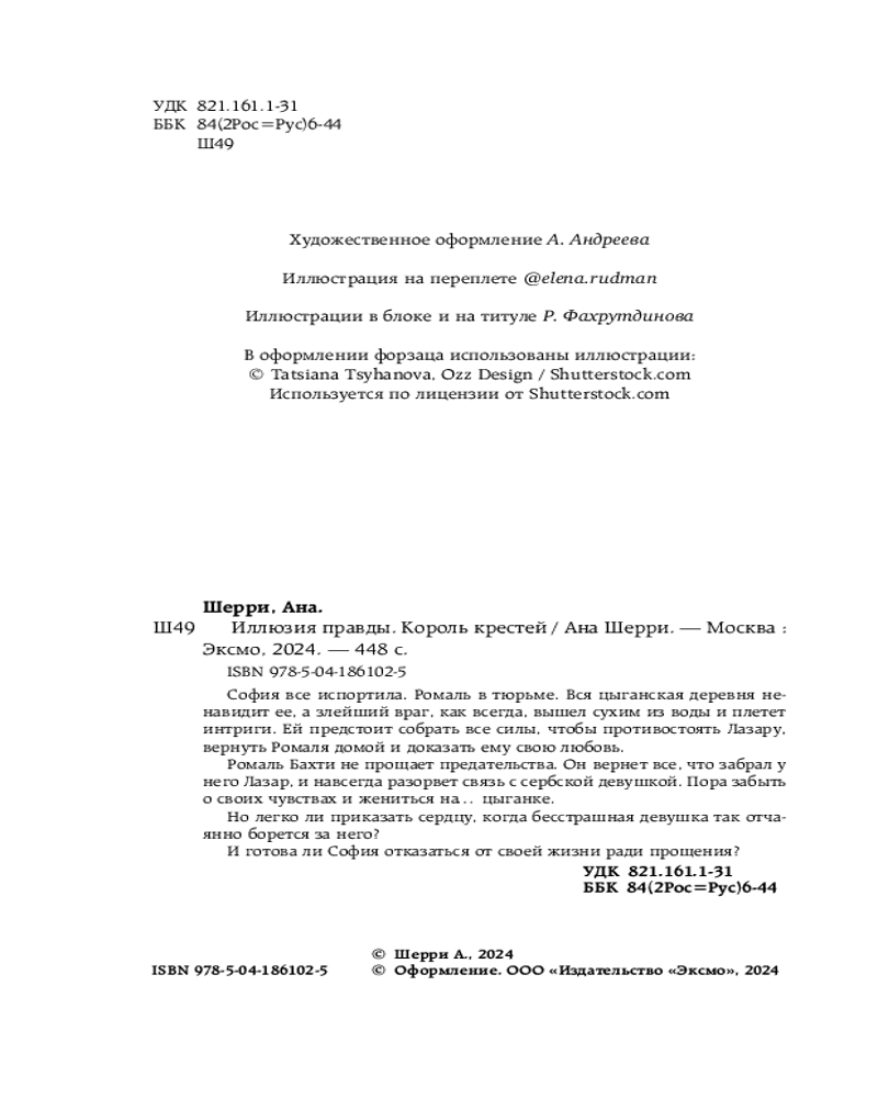 Иллюзия правды. Король крестейлегко читается непредсказуемый сюжет оформление автор В данный момент этот товар отсутствует в продаже. Возможно, у нас найдется аналогичный или похожий товар здесь. Серия: Одно небо на двоих (покет большого формата) София все испортила. Ромаль в тюрьме. Вся цыганская деревня ненавидит ее, а злейший враг, как всегда, вышел сухим из воды и плетет интриги. Ей предстоит собрать все силы, чтобы противостоять Лазару, вернуть Ромаля домой и доказать ему свою любовь. Ромаль Бахти не прощает предательств. Он вернет все, что забрал у него Лазар, и навсегда разорвет связь с сербской девушкой. Пора забыть о своих чувствах и жениться на... цыганке. Но легко ли приказать сердцу, когда бесстрашная девушка так отчаянно борется за него? И готова ли София отказаться от своей жизни ради прощения? |