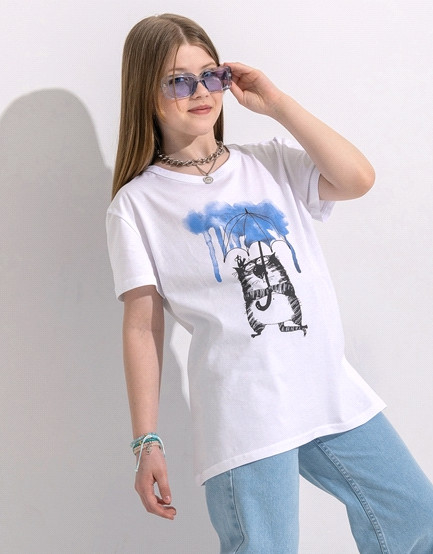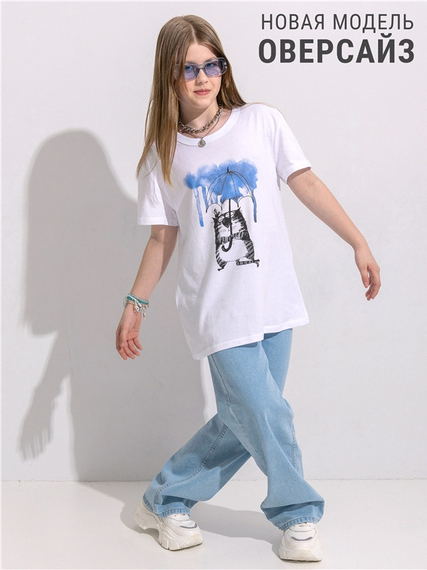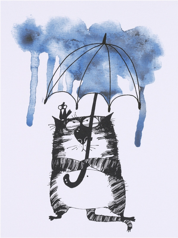 Футболка очень качественная. Хлопок. И милый котик под зонтом.