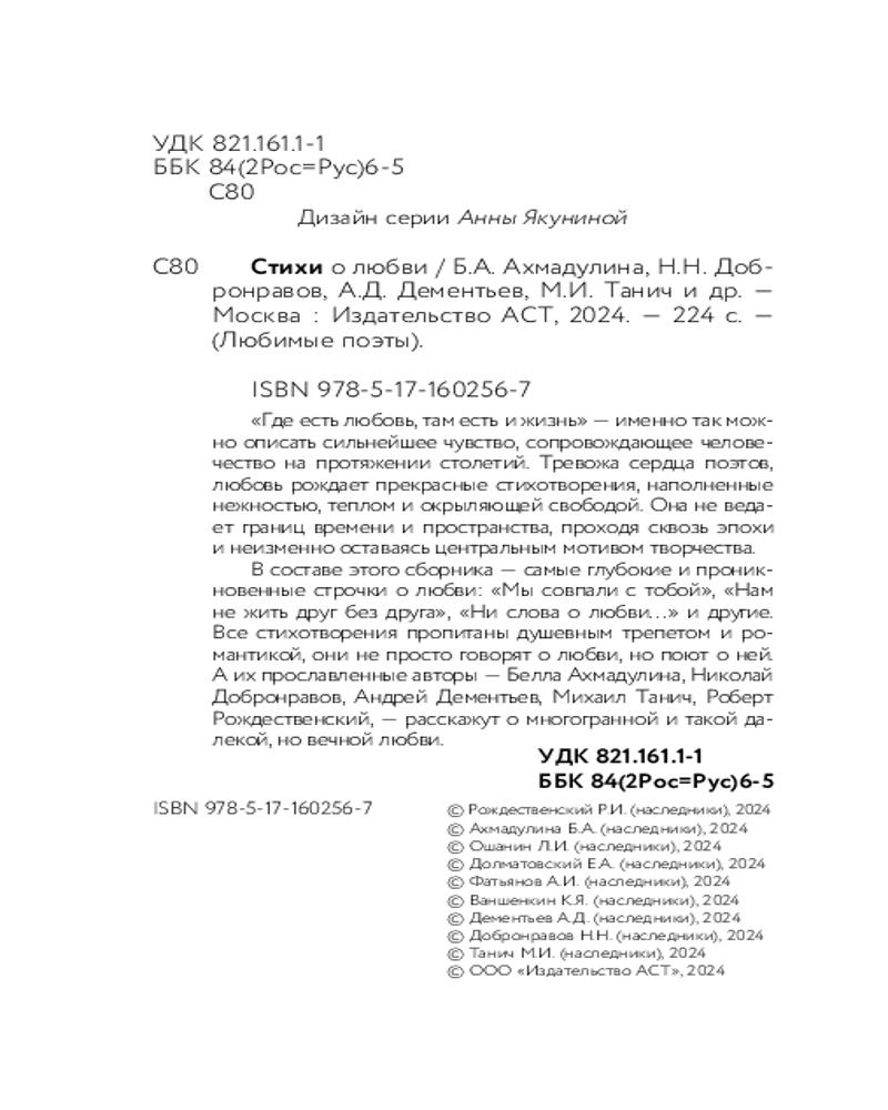💳 Оплатить за товар можно при получении 🇰🇿 Есть бесплатная доставка по Казахстану от 1 дня 🎁 Копите бонусы с каждой покупки Серия: Любимые поэты «Где есть любовь, там есть и жизнь» — именно так можно описать сильнейшее чувство, сопровождающее человечество на протяжении столетий. Тревожа сердца поэтов, любовь рождает прекрасные стихотворения, наполненные нежностью, теплом и окрыляющей свободой. Она не ведает границ времени и пространства, проходя сквозь эпохи и неизменно оставаясь центральным мотивом творчества. |