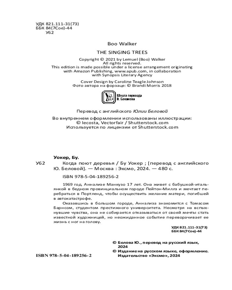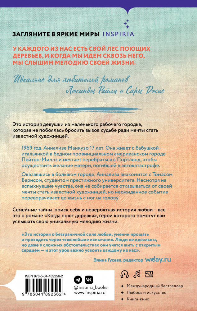 💳 Оплатить за товар можно при получении 🇰🇿 Есть бесплатная доставка по Казахстану от 1 дня 🎁 Копите бонусы с каждой покупки Серия: Novel. Мировые хиты Бу Уокера Даже если любовь сбила твой компас, не переставай плыть через свое море... Идеальная история для любителей книг Сары Джио и Люсинды Райли. Семейные тайны, поиск себя и невероятная история любви — все это о романе «Когда поют деревья», герои которого помогут вам услышать свою уникальную мелодию жизни. Это история девушки из маленького рабочего городка, которая не побоялась бросить вызов судьбе ради мечты стать известной художницей. 969 год. Аннализе Манкузо 17 лет. Она живет с бабушкой-итальянкой в бедном провинциальном городе Пейтон-Миллз и мечтает перебраться в Портленд, чтобы осуществить желание матери, погибшей в автокатастрофе. Оказавшись в большом городе, Аннализа знакомится с Томасом Барнсом, студентом престижного университета. Несмотря на вспыхнувшие чувства, она не собирается отказываться от своей мечты стать известной художницей, но неожиданное событие переворачивает ее жизнь с ног на голову. |