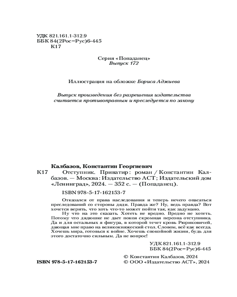 💳 Оплатить за товар можно при получении 🇰🇿 Есть бесплатная доставка по Казахстану от 1 дня 🎁 Копите бонусы с каждой покупки Серия: Попаданец Отказался от права наследования и теперь нечего опасаться преследований со стороны дяди. Правда же? Ну, ведь правда? Вот хочется верить, что хоть что-то может пойти так, как задумано. Ну что на это сказать. Хотеть не вредно. Вредно не хотеть. Потому что дядюшке не дает покоя скромная персона отступника. Да и для остальных я фигура, в которой течет кровь Рюриковичей, дающая мне право на великокняжеский стол. Словом, всё как всегда. Хочешь мира, готовься к войне. Хочешь спокойной жизни, будь для этого достаточно сильным. Да не вопрос! |
