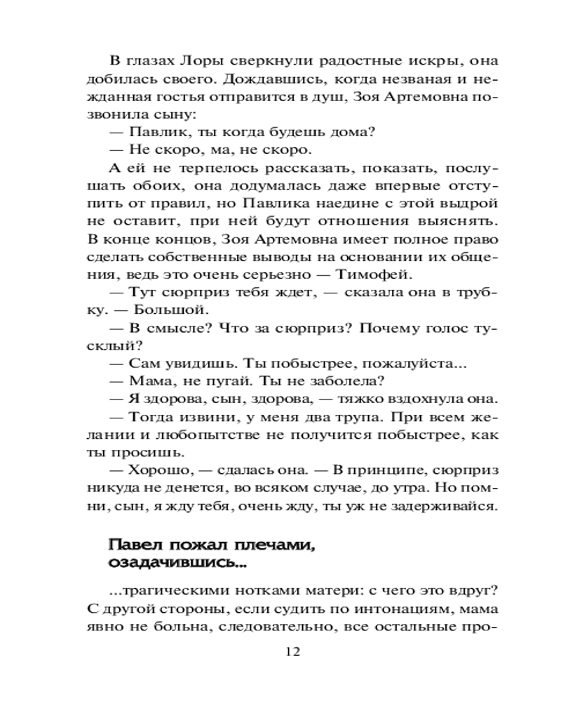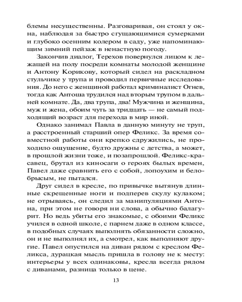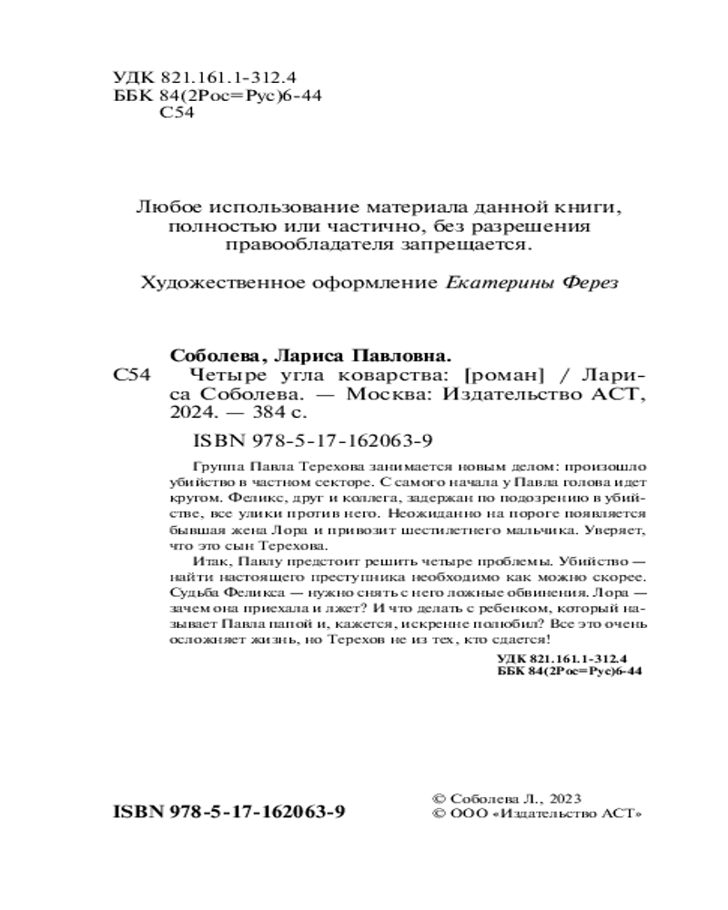 Четыре угла коварстваВ данный момент этот товар отсутствует в продаже. Возможно, у нас найдется аналогичный или похожий товар здесь. Серия: Она всегда с тобой. Детективы Ларисы Соболевой (м) Группа Павла Терехова занимается новым делом: произошло убийство в частном секторе. С самого начала у Павла голова идет кругом. Феликс, друг и коллега, задержан по подозрению в убийстве, все улики против него. Неожиданно на пороге появляется бывшая жена Лора и привозит шестилетнего мальчика. Уверяет, что это сын Терехова. Итак, Павлу предстоит решить четыре проблемы. Убийство — найти настоящего преступника необходимо как можно скорее. Судьба Феликса — нужно снять с него ложные обвинения. Лора — зачем она приехала и лжет? И что делать с ребенком, который называет Павла папой и, кажется, искренне полюбил? Все это очень осложняет жизнь, но Терехов не из тех, кто сдается! |