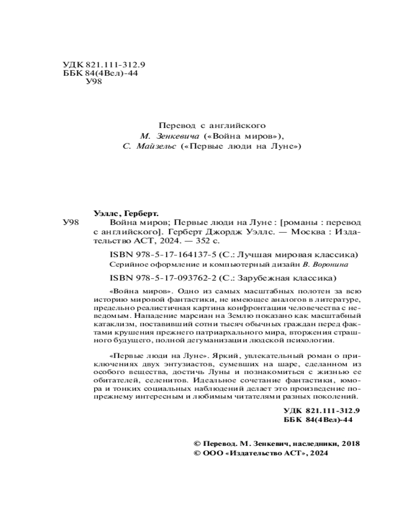 💳 Оплатить за товар можно при получении 🇰🇿 Есть бесплатная доставка по Казахстану от 1 дня 🎁 Копите бонусы с каждой покупки Серия: Лучшая мировая классика «Война миров». Одно из самых масштабных полотен за всю историю мировой фантастики, не имеющее аналогов в литературе, предельно реалистичная картина конфронтации человечества с неведомым. Нападение марсиан на Землю показано как масштабный катаклизм, поставивший сотни тысяч обычных граждан перед фактом крушения прежнего патриархального мира, вторжения страшного будущего, полной дегуманизации людской психологии. |