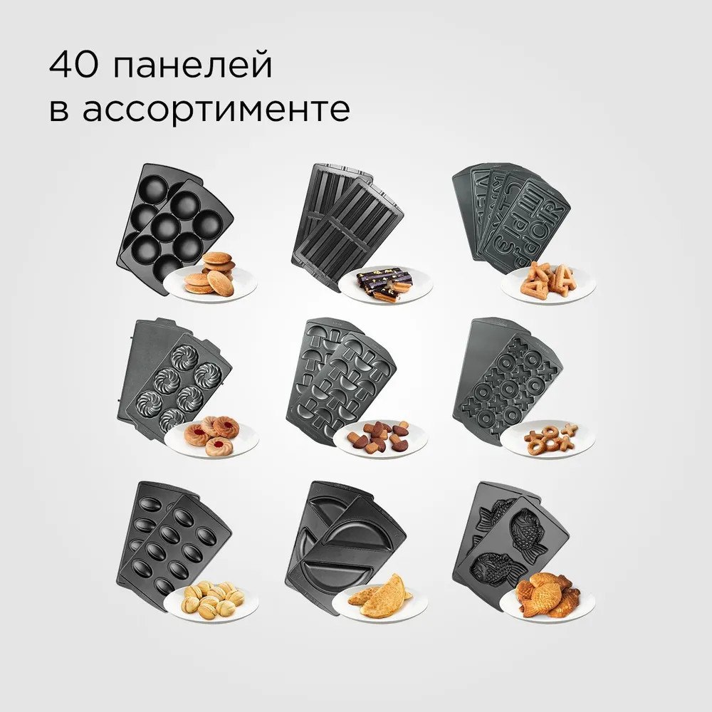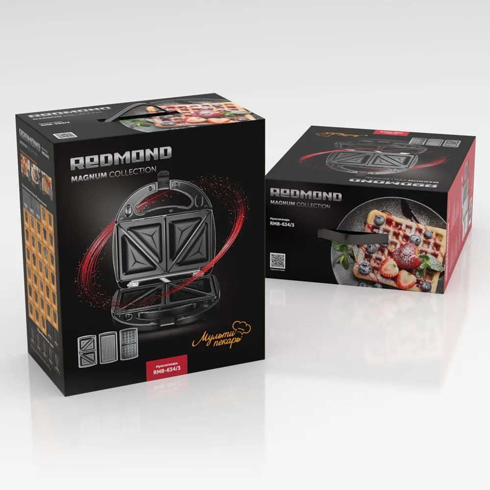 В комплект RMB-634/3 входит три пары съемных панелей: RAMB-01 (Сэндвич) — для приготовления горячих сэндвичей и бутербродов. Сытные сэндвичи с мясной или рыбной начинкой станут отличным перекусом, а сладкие сэндвичи со сгущенкой и фруктовой начинкой можно подать в качестве десерта к чаю или кофе; RAMB-02 (Венские вафли) — для выпекания пышных венских вафель. Также на панели «Венские вафли» можно приготовить несладкие закусочные вафли с любыми начинками; RAMB-03 (Гриль) — рифленая панель для приготовления курицы и рыбы гриль, обжарки овощей.