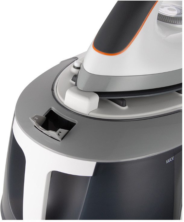 Для снятия утюга нужно нажать другую, оранжевую кнопку на корпусе базы (она опустит фиксатор) и, удерживая ее, сдвинуть утюг вправо. Платформа выполнена из термоустойчивого пластика и оснащена тремя резиновыми выступами. На дне базы: 4 ножки с резиновыми накладками, наклейка с технической информацией и клапан. Открутив его, можно слить воду в процессе очистки прибора от накипи. Съемный резервуар для воды объемом 1,2 л изготовлен из затемненного матового пластика, дополненного глянцевой серой вставкой вверху.