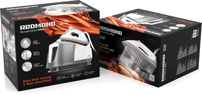 В данный момент этот товар отсутствует в продаже. Возможно, у нас найдется аналогичный или похожий товар здесь. Это мощное устройство с постоянной подачей пара в 150 г/мин и функцией парового удара в 500 г/мин. К особенностям этой модели со съемным резервуаром для воды объемом 1,2 л также относятся системы автоотключения и встроенной защиты от накипи. Парогенератор упакован в большую красивую коробку, оформленную в фирменной стилистике Redmond. На гранях упаковки размещены фотографии устройства, логотип компании, полное название модели, описание ее ключевых особенностей и краткий список технических характеристик.