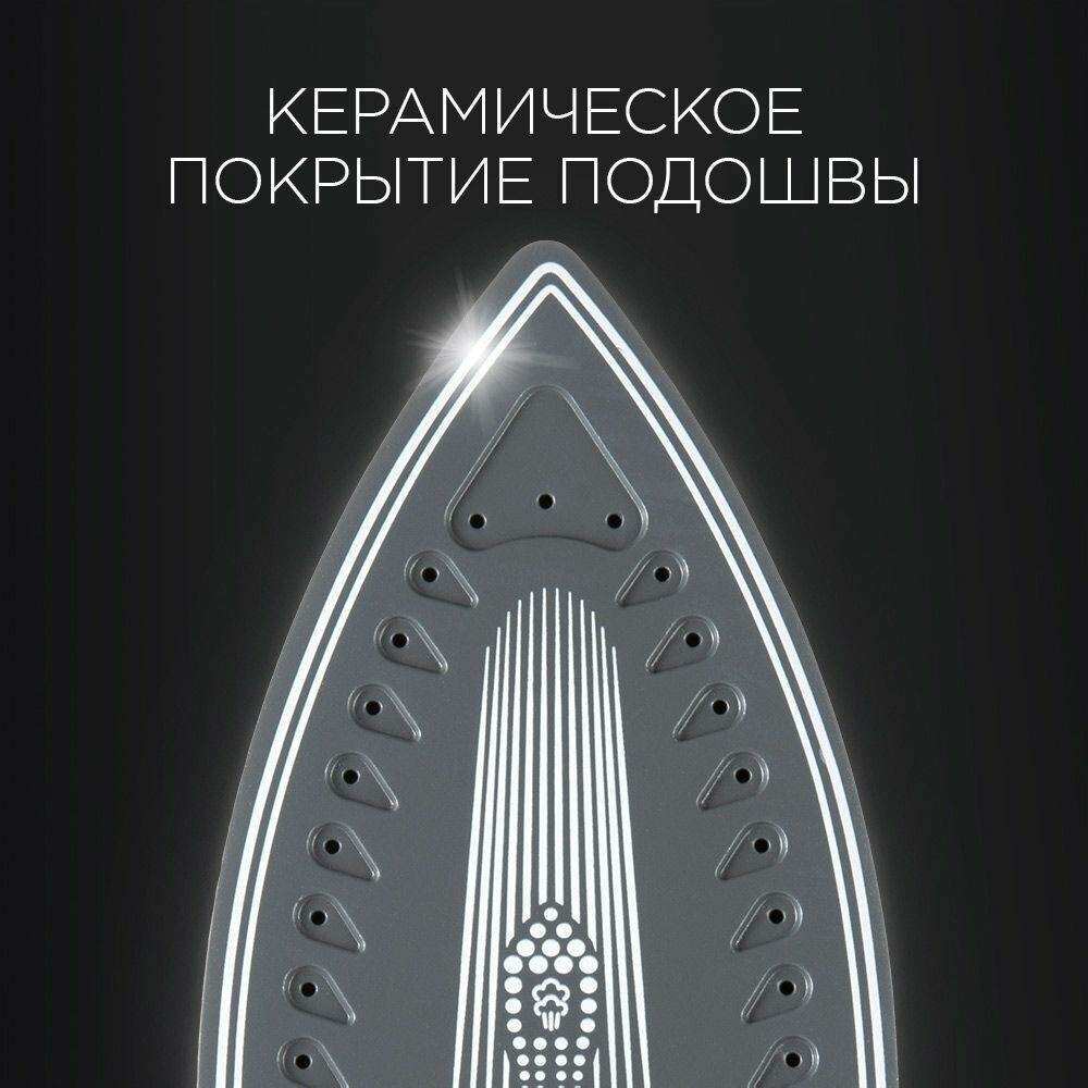 Подошва утюга обработана керамическим антипригарным покрытием. Отверстия выхода пара расположены в один ряд вдоль боковых граней подошвы, с тремя отверстиями в зауженной вершине. Благодаря шарнирному креплению тугой паровой шланг не мешает утюгу устойчиво держаться на поверхности. На ней находится кнопка, активирующая функцию парового удара. С внутренней стороны ручки расположена кнопка просто подачи пара. При работе она приходится точно под указательный палец. Удобная широкая ручка с внешней стороны оснащена противоскользящей вставкой. Под ней на корпусе утюга размещено колесо-регулятор нагрева подошвы, а рядом — индикатор нагрева. Колесо крутится тактово со щелчками. В период бездействия утюг лежит на специальной площадке в скошенной части базы, опираясь своей основой на специальный выступ. Носик при этом удерживается еще одним выступом и кнопкой-фиксатором сбоку.