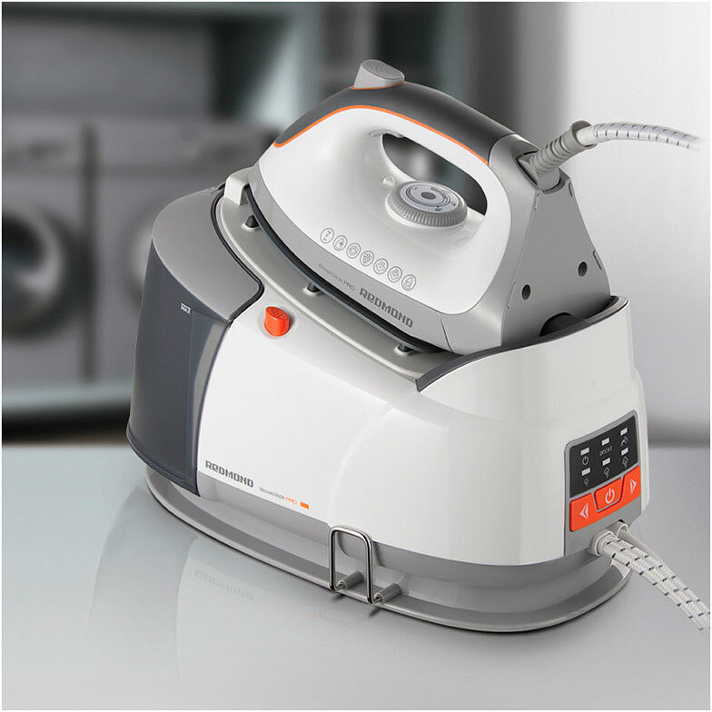 Корпус Redmond RSS-5908 покрыт глянцевым пластиком бело-серой расцветки. Немногочисленные элементы управления и прорезиненная вставка на ручке выделены оранжевым. Нейтральный спокойный дизайн прибора смотрится аккуратно и очень симпатично. Типовая конструкция парогенератора состоит из основания (базы) с бойлером для воды и утюгом. Последний соединен с базой паровым шлангом в нитяной оплетке. Длина шланга — 150 см. Место шарнирного крепления шланга с утюгом закрыто 5-сантиметровым гибким кожухом из прочной резины. Сам утюг имеет стандартную каплевидную форму. Весит он ровно килограмм.