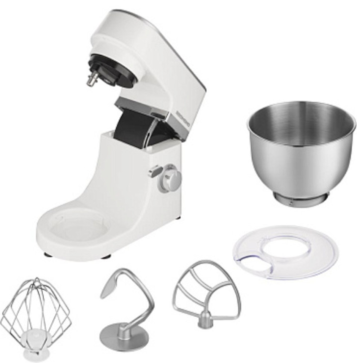 Мощный планетарный миксер может вращать насадки с 8 скоростями. Устанавливайте и регулируйте скорость с помощью удобного переключателя на корпусе прибора. Для замешивания густого дрожжевого теста выберите малую скорость, для приготовления бисквита или крема — среднюю, для получения устойчивой воздушной белковой пены — высокую. Чтобы тщательно обработать многокомпонентную смесь, рекомендуется сначала выбрать небольшую скорость, а потом постепенно увеличивать ее.