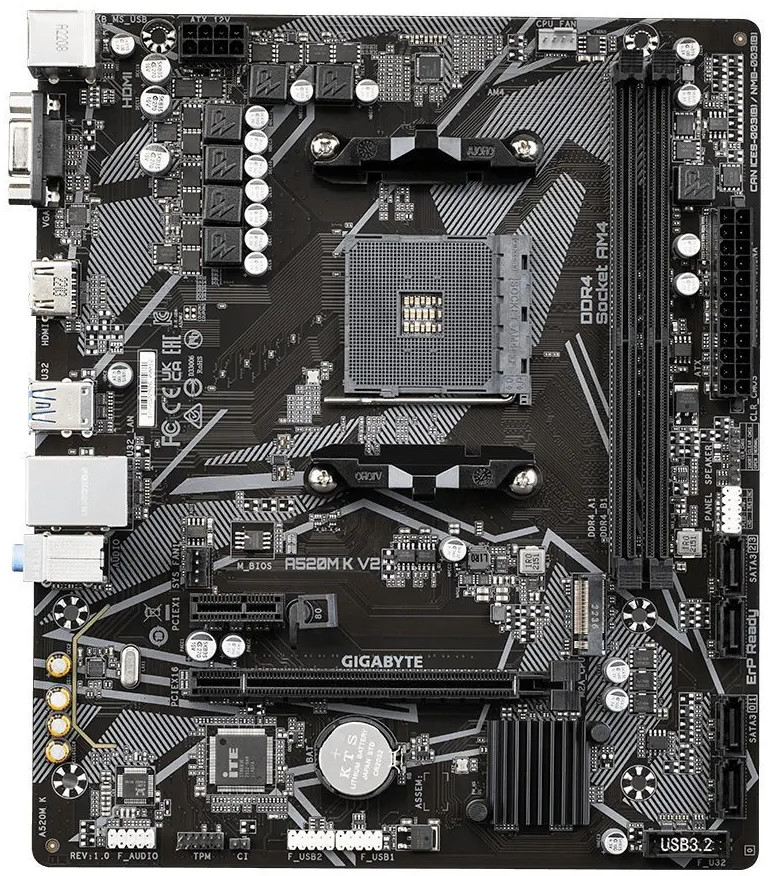 GIGABYTE A520M K V2 оборудована сетевым адаптером 1 Гбит/с для соединения с Интернетом. На панели с интерфейсами расположены порты USB, видеовыходы HDMI и VGA, разъемы аудио 3.5 мм и PS/2. Плата разработана с применением надежных компонентов и технологий, что служит гарантией стабильной и безотказной работы.