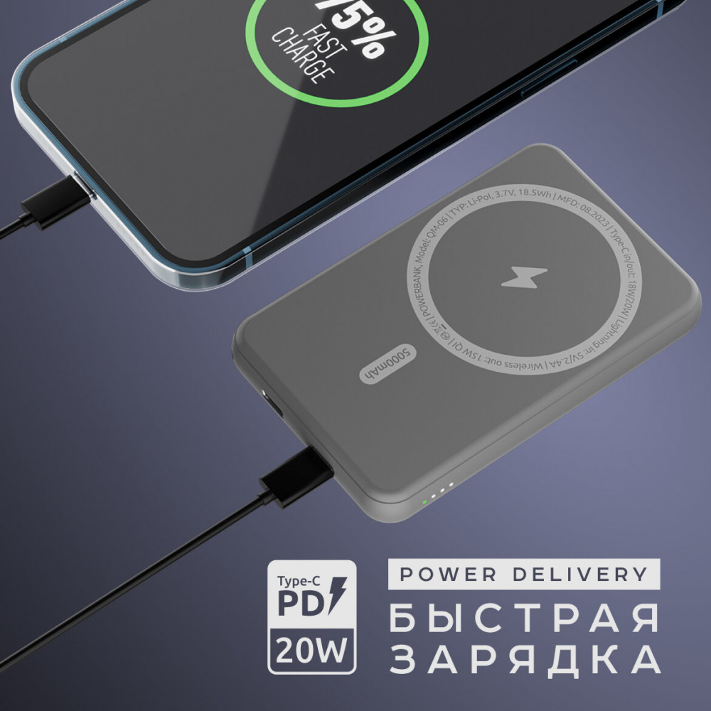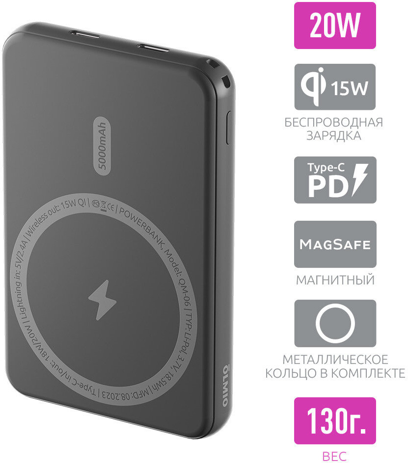 💳 Оплатить за товар можно при получении 🇰🇿 Есть бесплатная доставка по Казахстану от 1 дня 🎁 Копите бонусы с каждой покупки Магнитный внешний аккумулятор OLMIO QM-06 с беспроводной зарядкой, MagSafe, 15W, 5000mAh. Внешний аккумулятор (Powerbank) серия QM-06 от OLMIO — это идеальное решение для продолжительной работы ваших устройств без доступа к электричеству. Оснащенный передовой технологией быстрой зарядки, он способен заряжать ваш смартфон или другое устройство до 4 раз быстрее, чем обычные внешние аккумуляторы. Отличительной особенностью данной модели является наличие беспроводной зарядки, что делает процесс зарядки вашего устройства еще более удобным и простым. Просто разместите ваше устройство на верхней панели аккумулятора, и зарядка начнется автоматически. Встроенный LED-индикатор позволяет контролировать уровень заряда аккумулятора, а компактный дизайн и легкий вес делают его идеальным спутником в путешествиях и деловых поездках. Высококачественные литий-полимерные элементы обеспечивают длительное время работы аккумулятора между зарядками и надежную защиту от короткого замыкания, перегрева и перегрузок. |