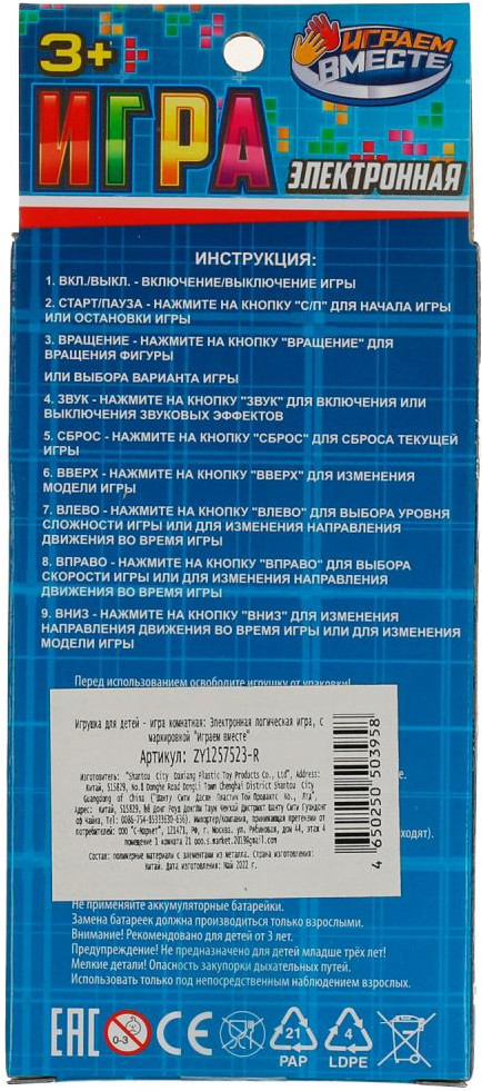 💳 Оплатить за товар можно при получении 🇰🇿 Есть бесплатная доставка по Казахстану от 1 дня 🎁 Копите бонусы с каждой покупки Электронная логическая игра ТМ «Играем вместе» станет прекрасным подарком для маленького любознайки. Эта занимательная головоломка надолго увлечёт ребёнка. Он с лёгкостью освоит управление и в увлекательной форме сможет развивать своё логическое мышление. |