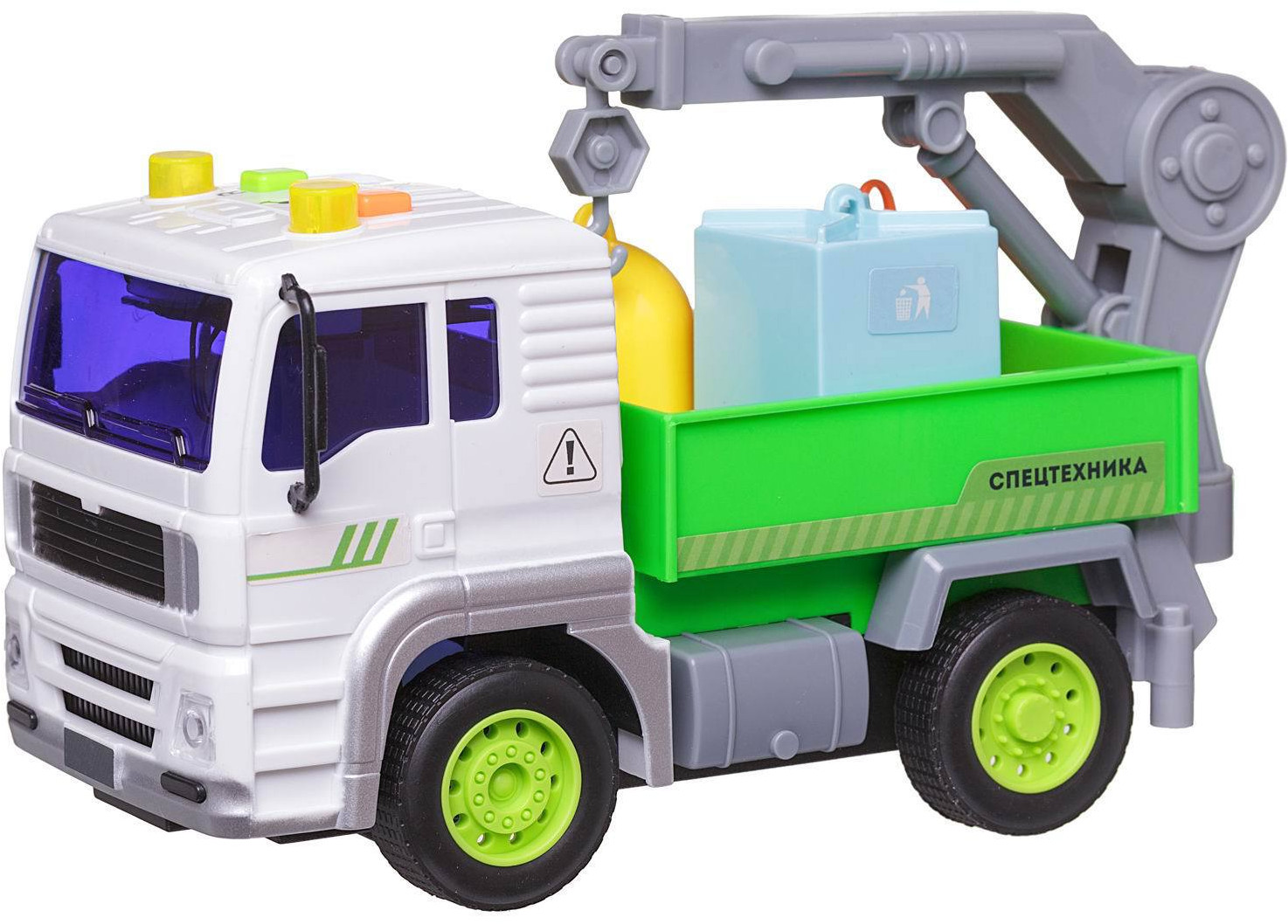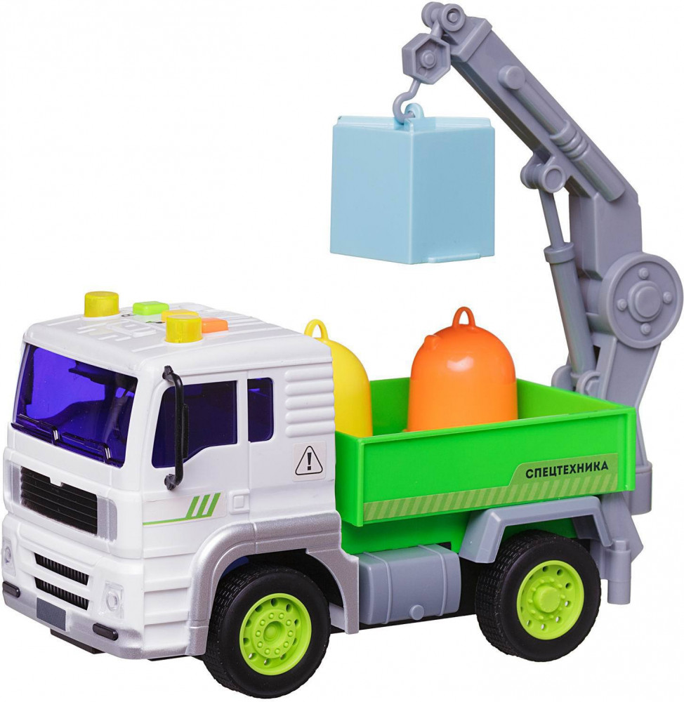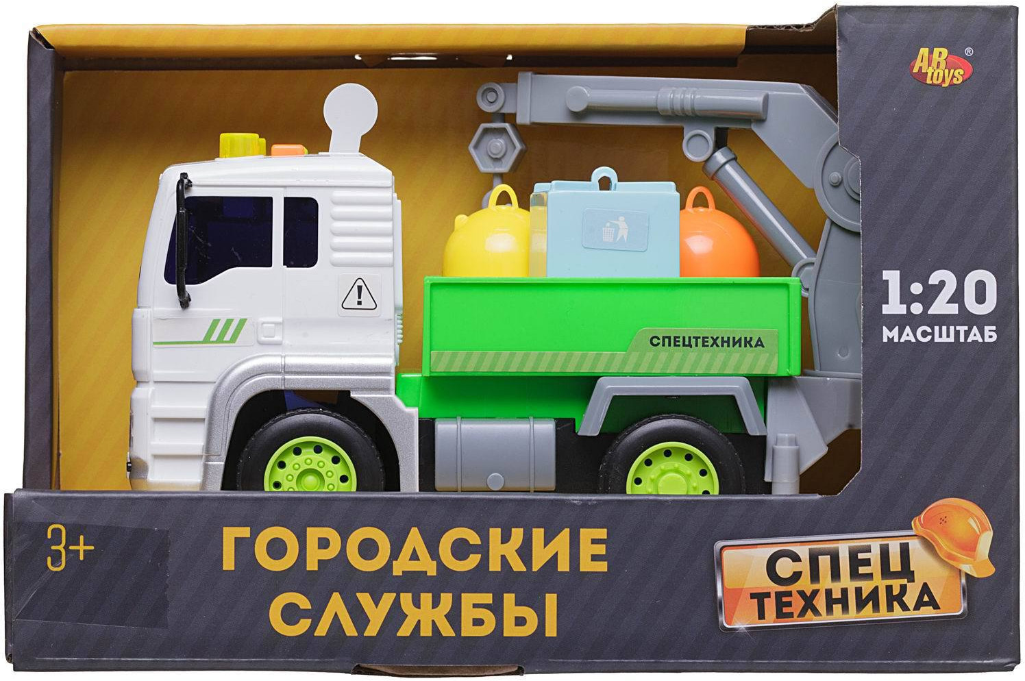 ABtoys Мусоровоз с мусорными бакамиВ данный момент этот товар отсутствует в продаже. Возможно, у нас найдется аналогичный или похожий товар здесь. Машинка представляет собой грузовичок, который перевозит мусорные баки внутри открытого кузова. Прикрепленная функциональная стрела для подъема баков закреплена в задней части. Дополняют набор три мусорных бака разной формы и расцветки, которые имеют открывающиеся крышки. При нажатии на кнопки на крыше кабины включаются звуковые эффекты (звук работы двигателя, сигнал обычной и аварийной остановки, звук заведенной машины) и мерцающая подсветка сигнальных огней. Через игру с машинкой можно объяснить ребенку: что такое экология, почему важно выкидывать мусор в специальные баки, куда исчезают отходы из мусоровозов. |