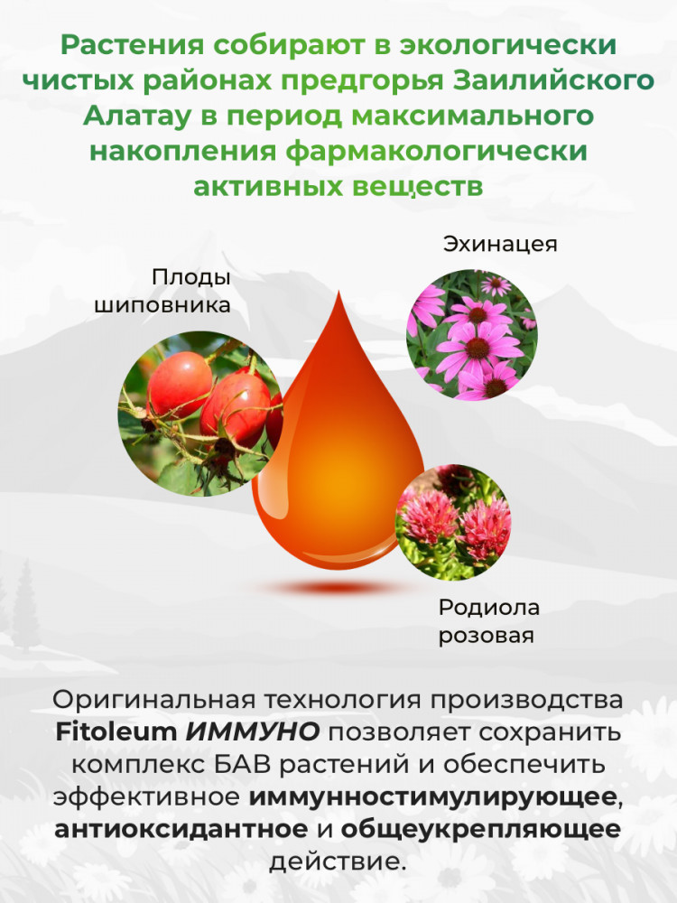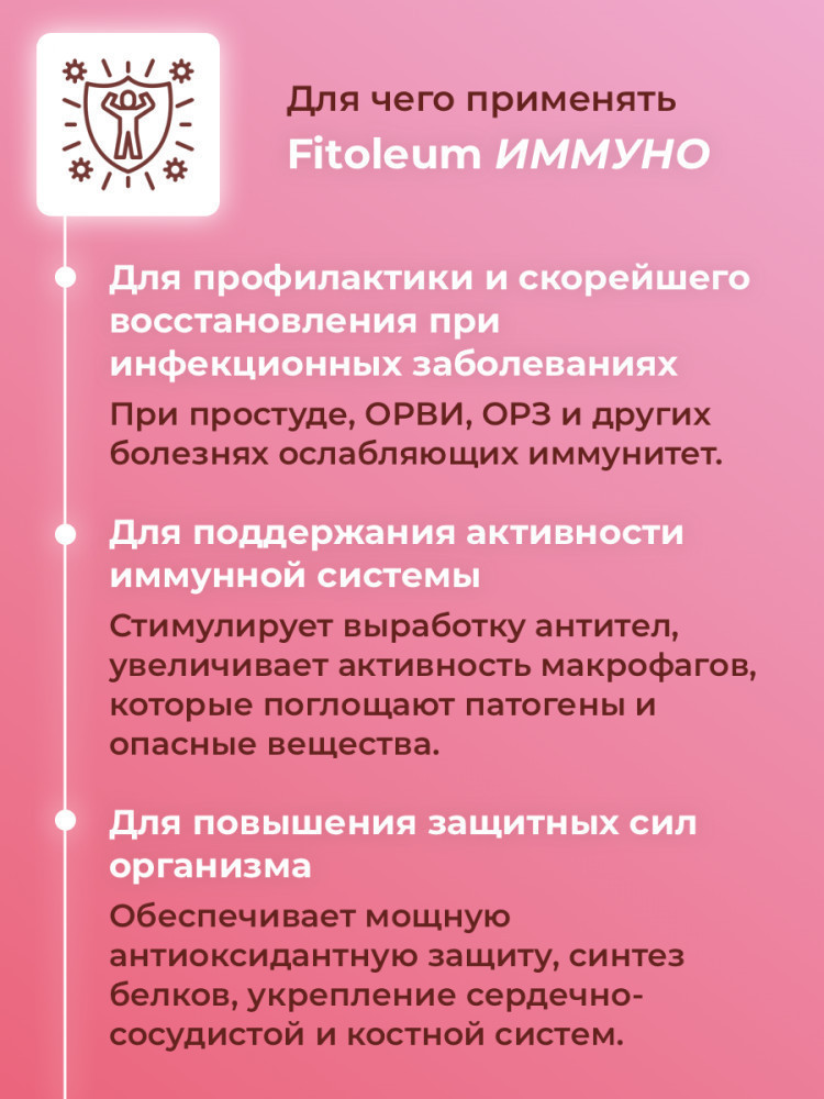 💳 Оплатить за товар можно при получении 🇰🇿 Есть бесплатная доставка по Казахстану от 1 дня 🎁 Копите бонусы с каждой покупки Фито-масло Fitoleum ИММУНО — натуральный иммуномодулятор с высокой антиоксидантной защитой. Переводит иммунную систему в режим повышенной активности и обеспечивает надежную профилактику от инфекционных заболеваний. Уникальная формула представляет собой 100% натуральный экстракт изготовленный по оригинальной технологии из 3 видов целебных растений (шиповник, эхинацея и родиола розовая). Оригинальная технология производства фито-масла Fitoleum ИММУНО позволяет извлекать и сохранять биологически активные компоненты из растений, и обеспечивать: иммунностимулирующее, антиоксидантное и общеукрепляющее действие. |