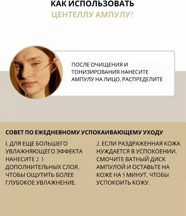 Корейская Ампула, содержащая 100% сока экстракта листьев центеллы азиатской, призвана значительно улучшить внешний вид кожи, запуская процессы восстановления и оздоровления на клеточном уровне. Также средство помогает повысить тонус и упругость зрелой кожи, сделать ее более гладкой и подтянутой. С первой капли ампула мгновенно увлажняет, снимает раздражения и покраснения, предотвращает высыпания, нормализует работу сальных желез, восстанавливает естественные защитные барьеры кожи и уменьшает глубину и выраженность морщин.