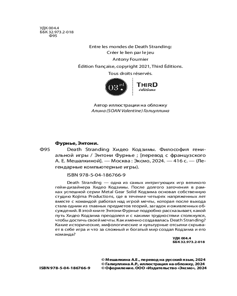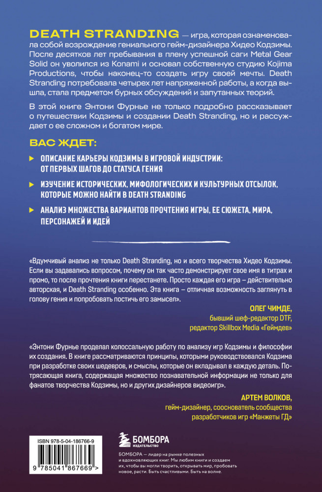 💳 Оплатить за товар можно при получении 🇰🇿 Есть бесплатная доставка по Казахстану от 1 дня 🎁 Копите бонусы с каждой покупки Серия: Легендарные компьютерные игры Death Stranding — игра, которая ознаменовала собой возрождение гениального гейм-дизайнера Хидео Кодзимы. После десятков лет пребывания в плену успешной саги Metal Gear Solid он уволился из Konami и основал собственную студию Kojima Productions, чтобы наконец-то создать игру своей мечты. Death Stranding потребовала четырех лет напряженной работы, а когда вышла, стала предметом бурных обсуждений и запутанных теорий. В этой книге Энтони Фурнье не только подробно рассказывает о путешествии Кодзимы и создании Death Stranding, но и рассуждает о ее сложном и богатом мире. |