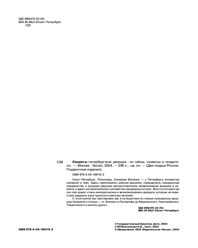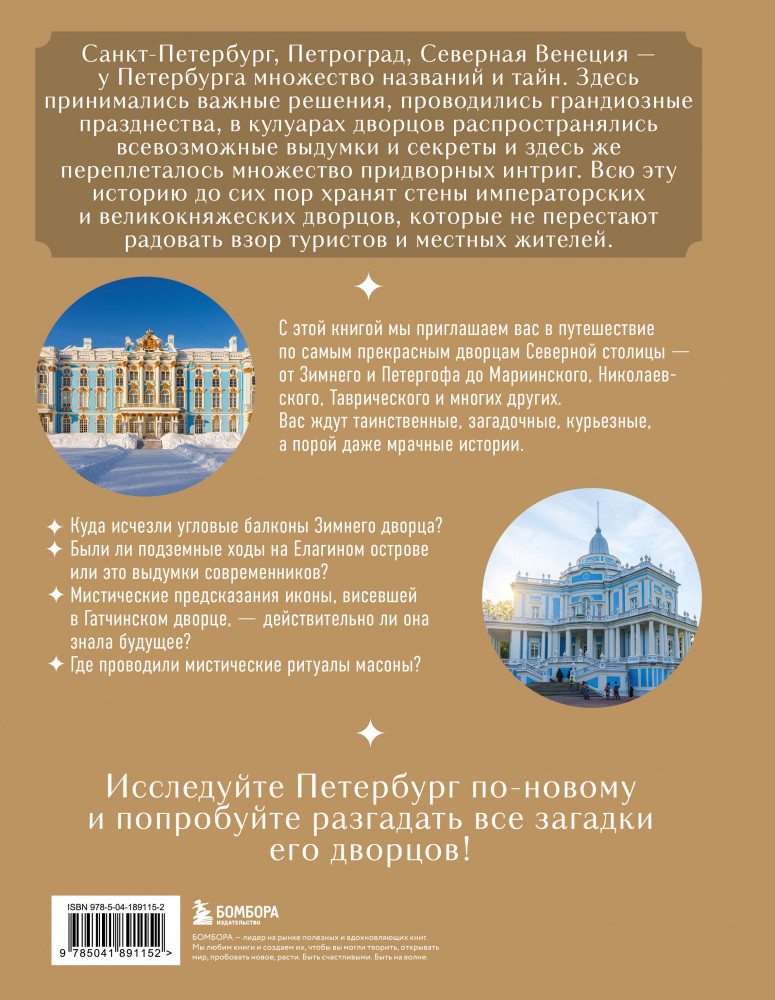 💳 Оплатить за товар можно при получении 🇰🇿 Есть бесплатная доставка по Казахстану от 1 дня 🎁 Копите бонусы с каждой покупки Серия: Два сердца России. Подарочные издания Санкт-Петербург, Петроград, Северная Венеция — у Петербурга множество названий и тайн. Здесь принимались важные решения, проводились грандиозные празднества, в кулуарах дворцов распространялись всевозможные выдумки и секреты, и здесь же переплеталось множество придворных интриг. Всю эту историю до сих пор хранят стены императорских и великокняжеских дворцов, которые не перестают радовать взор туристов и местных жителей. |