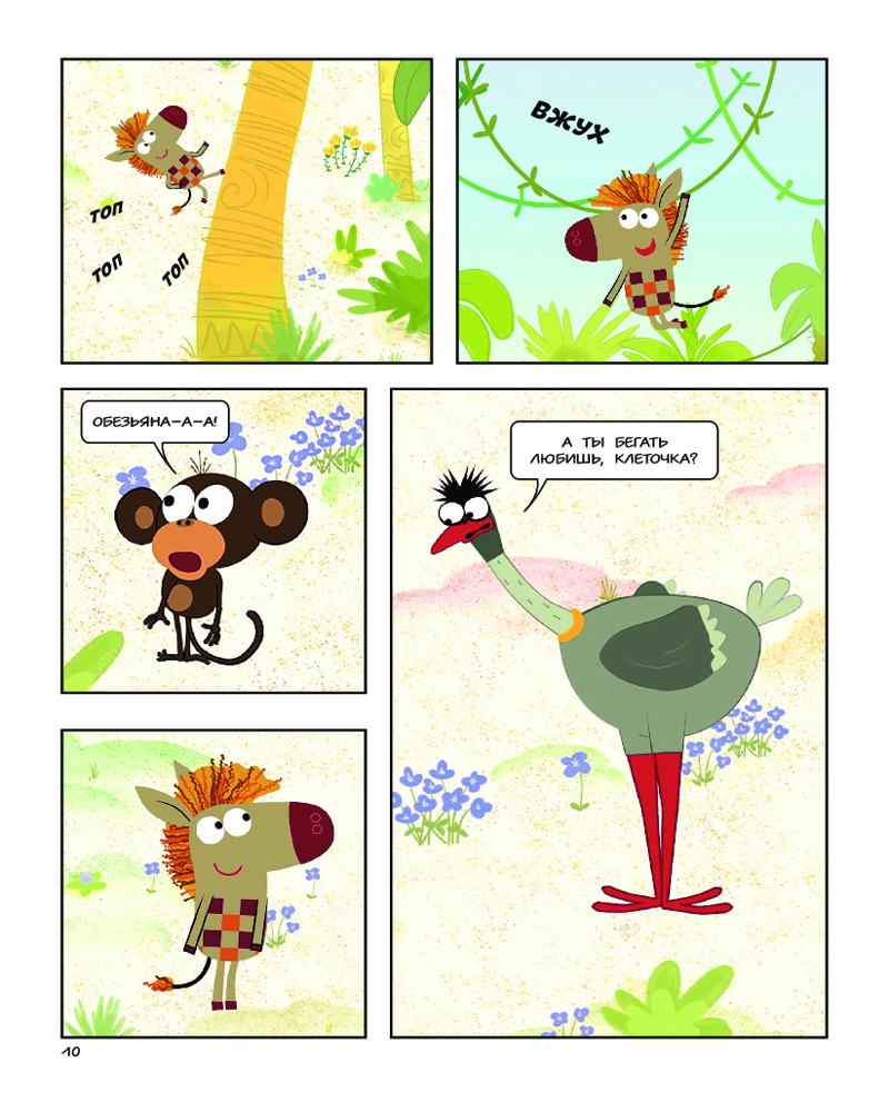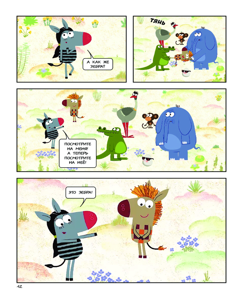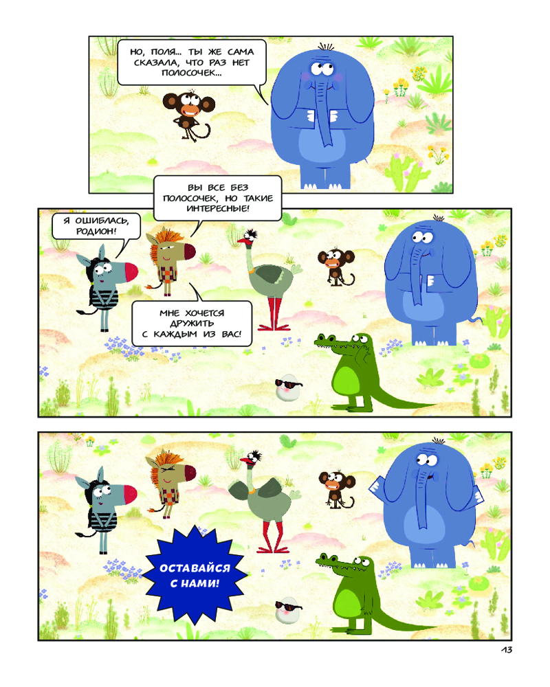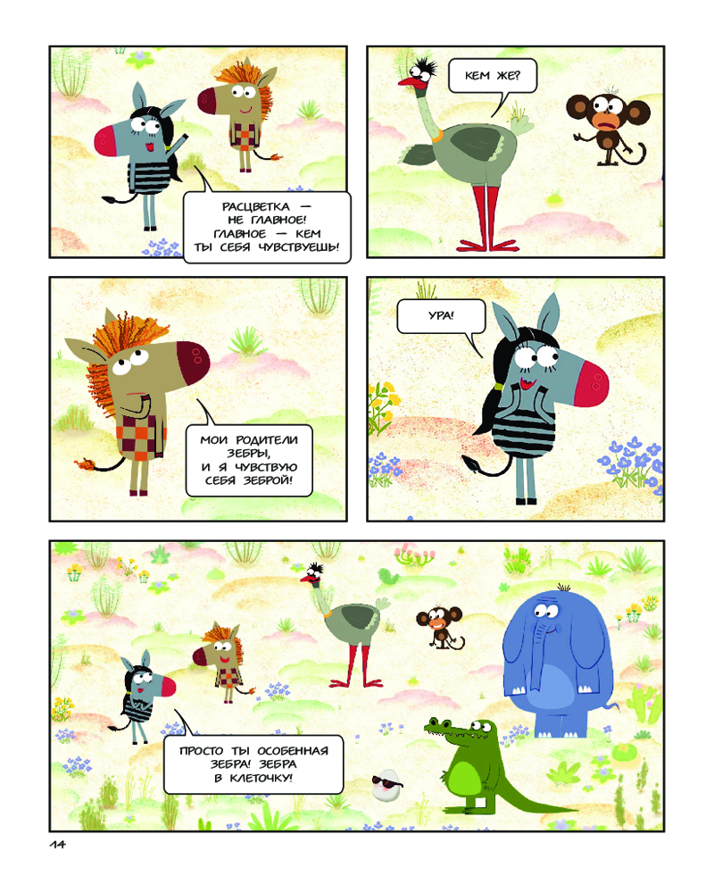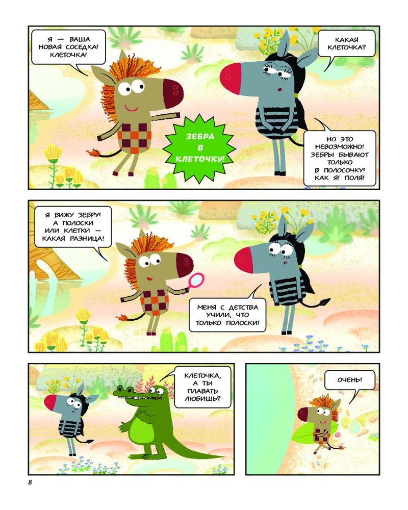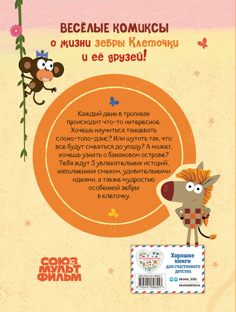 Серия: Союзмультфильм. Комиксы для тех, кто «ужасно боится всего скучного»! В тропиках живут совершенно разные звери: дисциплинированная зебра Поля, смелая обезьяна Яна, робкий слон Родион, добрый крокодил Гоша и неразлучные братья-страусы Паша и Петя. Но уникальная зебра без полосочек может найти общий язык со всеми. На своём примере Клеточка покажет, как важно быть смелым, решительным и дружелюбным. Звери научатся понимать друг друга, находить компромисс, не стесняться своих интересов и не обижать других ради шутки. |