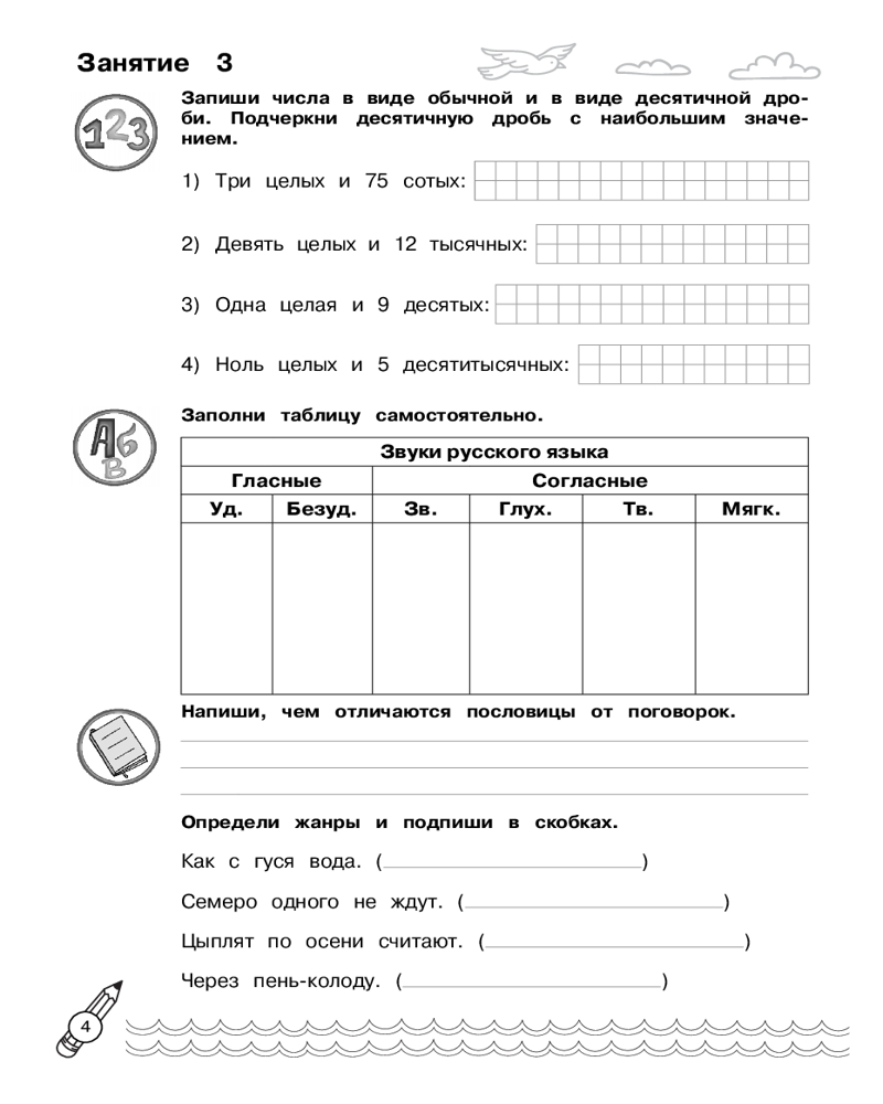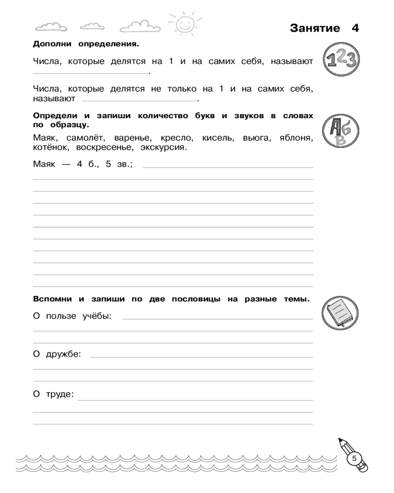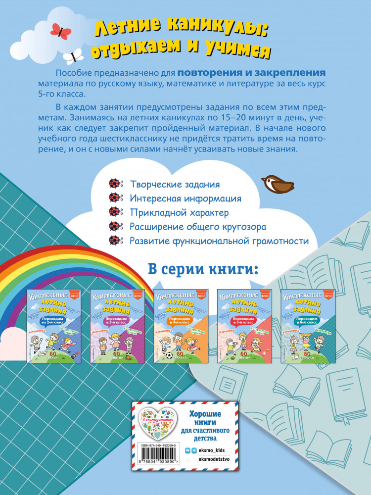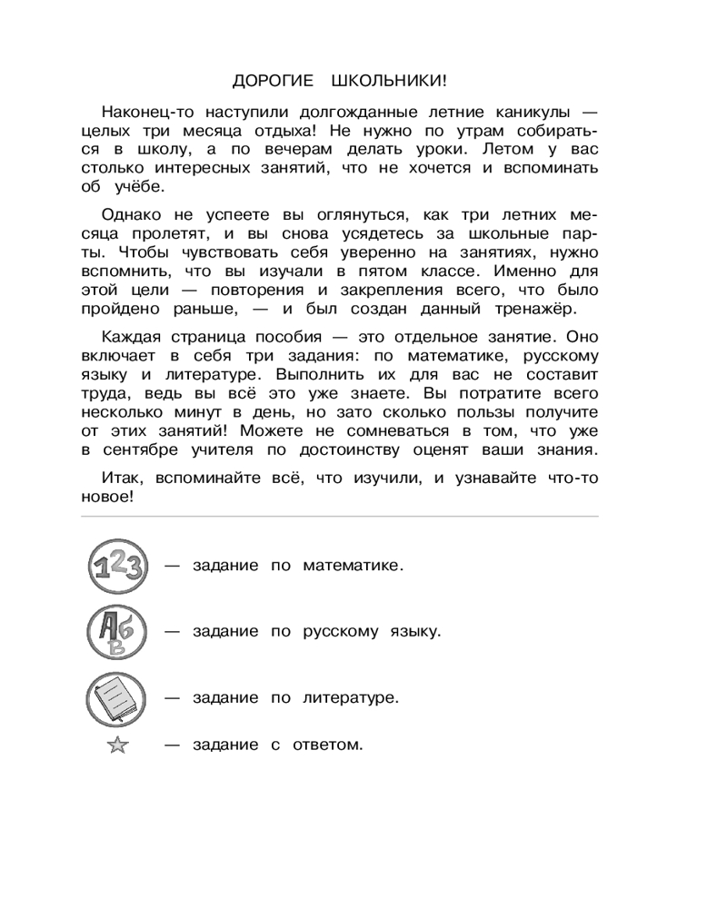 В данный момент этот товар отсутствует в продаже. Возможно, у нас найдется аналогичный или похожий товар здесь. Серия: Летние каникулы: отдыхаем и учимся Тренажёр для учеников начальной школы подготовлен для повторения и закрепления всего пройденного материала за курс 5 класса. Пособие состоит из 60 занятий, каждое из которых включает в себя задания по математике, русскому языку, литературному чтению и окружающему миру. В день надо выполнить одно занятие, в котором комплексно представлены задания сразу по четырём основным предметам. Они отмечены соответствующими значками. Это очень удобно — ученик переключается с одного упражнения на другое, повторяет все предметы, но при этом не теряет интереса к занятиям из-за их разнообразия.