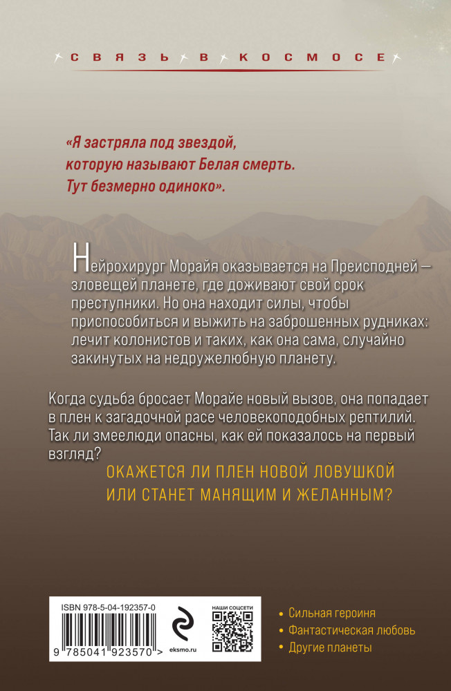 💳 Оплатить за товар можно при получении 🇰🇿 Есть бесплатная доставка по Казахстану от 1 дня 🎁 Копите бонусы с каждой покупки Серия: Связь в космосе Нейрохирург Морайя оказывается на Преисподней — зловещей планете, где доживают свой срок преступники. Но она находит силы, чтобы приспособиться и выжить на заброшенных рудниках: лечит колонистов, и таких как она сама, случайно закинутых на недружелюбную планету. Когда судьба бросает Морайе новый вызов, она попадает в плен к загадочной расе человекоподобных рептилий. Так ли змеелюди опасны, как ей показалось на первый взгляд? Окажется ли плен новой ловушкой или станет манящим и желанным? |