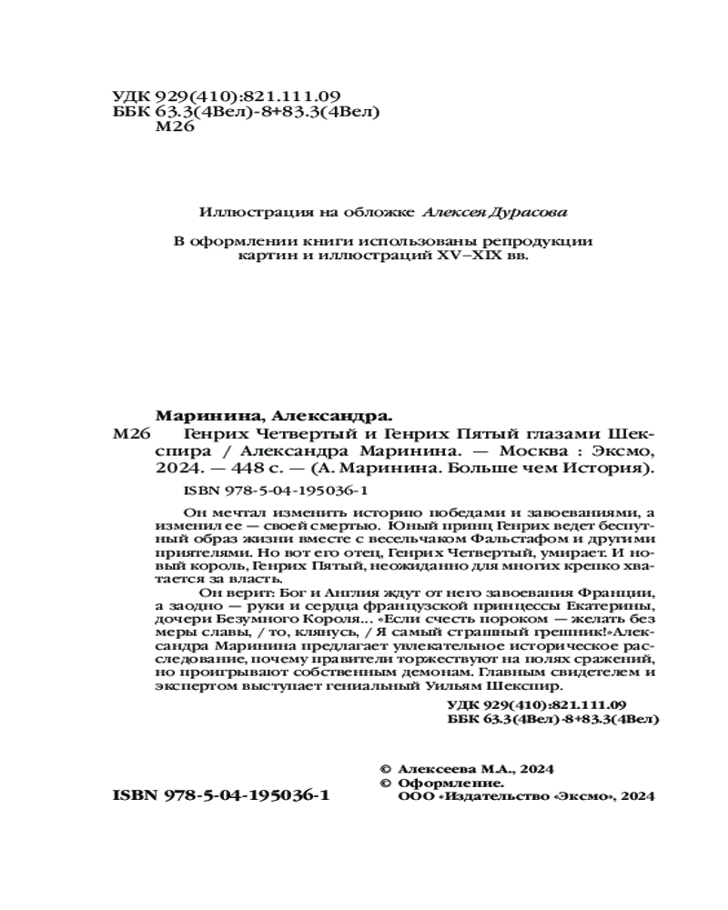 💳 Оплатить за товар можно при получении 🇰🇿 Есть бесплатная доставка по Казахстану от 1 дня 🎁 Копите бонусы с каждой покупки Серия: А.Маринина. Больше чем История Он мечтал изменить историю победами и завоеваниями, а изменил ее — своей смертью. Юный принц Генрих ведет беспутный образ жизни вместе с весельчаком Фальстафом и другими приятелями. Но вот его отец, Генрих Четвертый, умирает. И новый король, Генрих Пятый, неожиданно для многих крепко хватается за власть. Он верит: Бог и Англия ждут от него завоевания Франции, а заодно — руки и сердца французской принцессы Екатерины, дочери Безумного Короля... "Если счесть пороком — желать без меры славы, то, клянусь, Я самый страшный грешник!"Александра Маринина предлагает увлекательное историческое расследование, почему правители торжествуют на полях сражений, но проигрывают собственным демонам. Главным свидетелем и экспертом выступает гениальный Уильям Шекспир. |