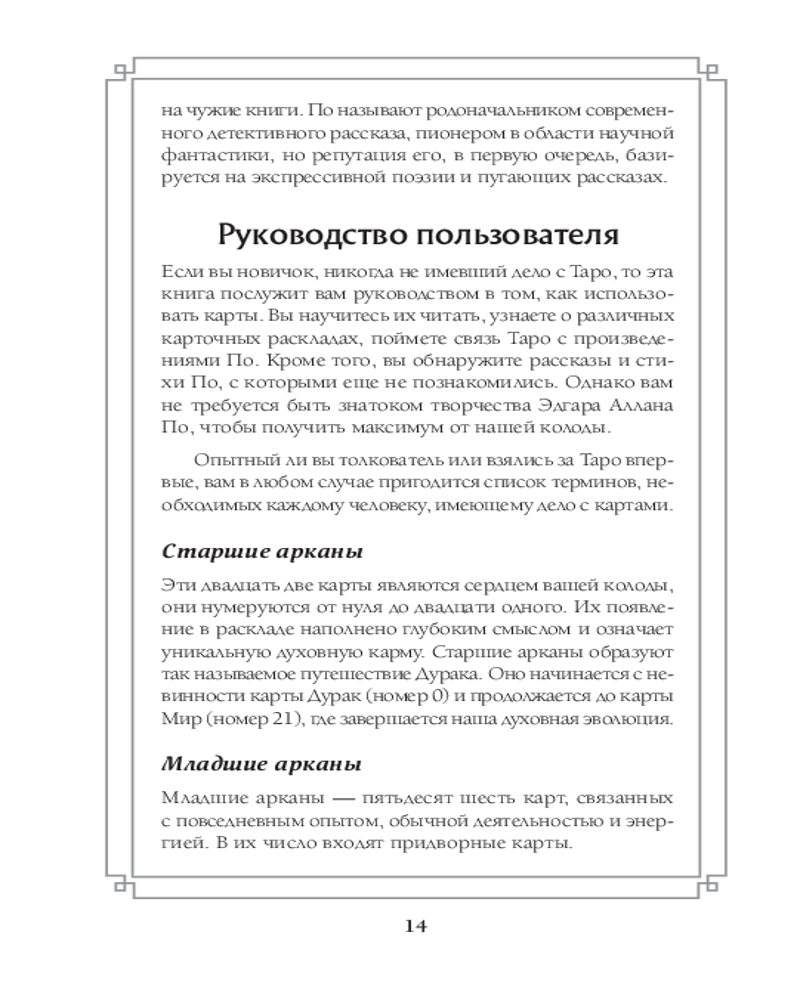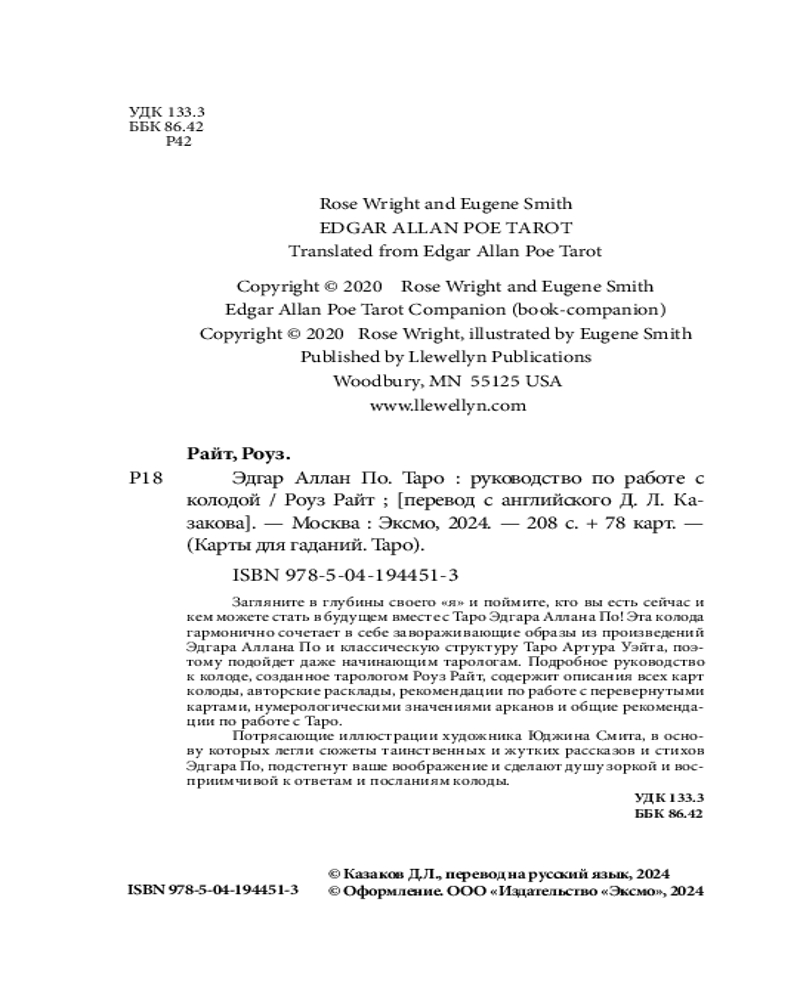 💳 Оплатить за товар можно при получении 🇰🇿 Есть бесплатная доставка по Казахстану от 1 дня 🎁 Копите бонусы с каждой покупки Серия: Карты для гаданий. Таро Загляните в глубины своего «я» и поймите — кто вы есть сейчас и кем можете стать в будущем вместе с Таро Эдгара Аллана По! Эта колода гармонично сочетает в себе завораживающие образы из произведений Эдгара Аллана По и классическую структуру Таро Артура Уэйта, поэтому подойдет даже начинающим тарологам. Подробное руководство к колоде, созданное тарологом Роуз Райт, содержит описания всех карт колоды, авторские расклады, рекомендации по работе с перевернутыми картами, нумерологическими значениями арканов и общие рекомендации по работе с Таро. Потрясающие иллюстрации художника Юджина Смита, в основу которых легли сюжеты таинственных и жутких рассказов и стихов Эдгара По, подстегнут ваше воображение и сделают душу зоркой и восприимчивой к ответам и посланиям колоды. |