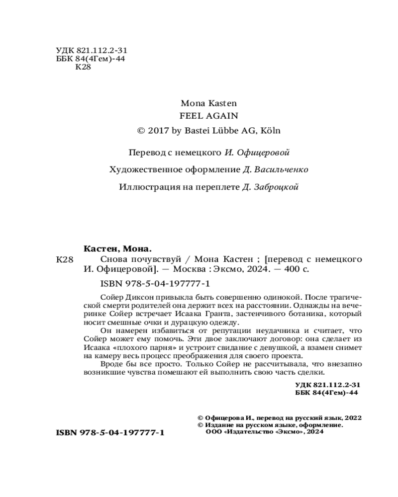 💳 Оплатить за товар можно при получении 🇰🇿 Есть бесплатная доставка по Казахстану от 1 дня 🎁 Копите бонусы с каждой покупки Серия: Young Adult. Абсолютный бестселлер Моны Кастен (лимитированное издание) «Снова почувствуй» — третья часть серии, благодаря которой читатели узнали о Моне Кастен. История Сойер и Исаака, которые тоже будут бороться за свою любовь. Бестселлер Spiegel! Издание выполнено в стиле лимитированной трилогии Save Me: шикарная иллюстрация с главными героями на обложке, закрашенный обрез с блестками. Абсолютный бестселлер! Тираж книг Моны Кастен уже перевалил отметку в 530 000 экземпляров в России и 2 млн экземпляров в Германии! |