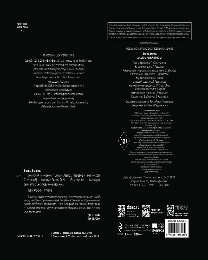 💳 Оплатить за товар можно при получении 🇰🇿 Есть бесплатная доставка по Казахстану от 1 дня 🎁 Копите бонусы с каждой покупки Серия: Медицинский атлас. Эксклюзивное издание Изысканное подарочное издание «Черной анатомии» перевернет ваше представление об атласах. Необычное оформление — золото и черный атлас — напомнит, как ценно человеческое тело. Автор книги Эмили Эванс собрала основные анатомические рисунки костей, мускулов и внутренних органов с подробными надписями. Изучение анатомии еще никогда не было так близко к искусству. |