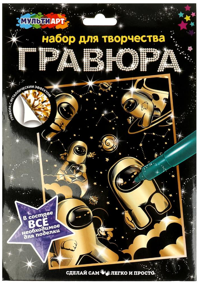 С помощью данного набора юный художник сможет создать эффектную золотую картину на чёрном фоне. Контур рисунка уже нанесён на основу, остаётся только процарапать изображение специальным штихелем. Готовую поделку можно подарить близким или использовать для украшения интерьера.