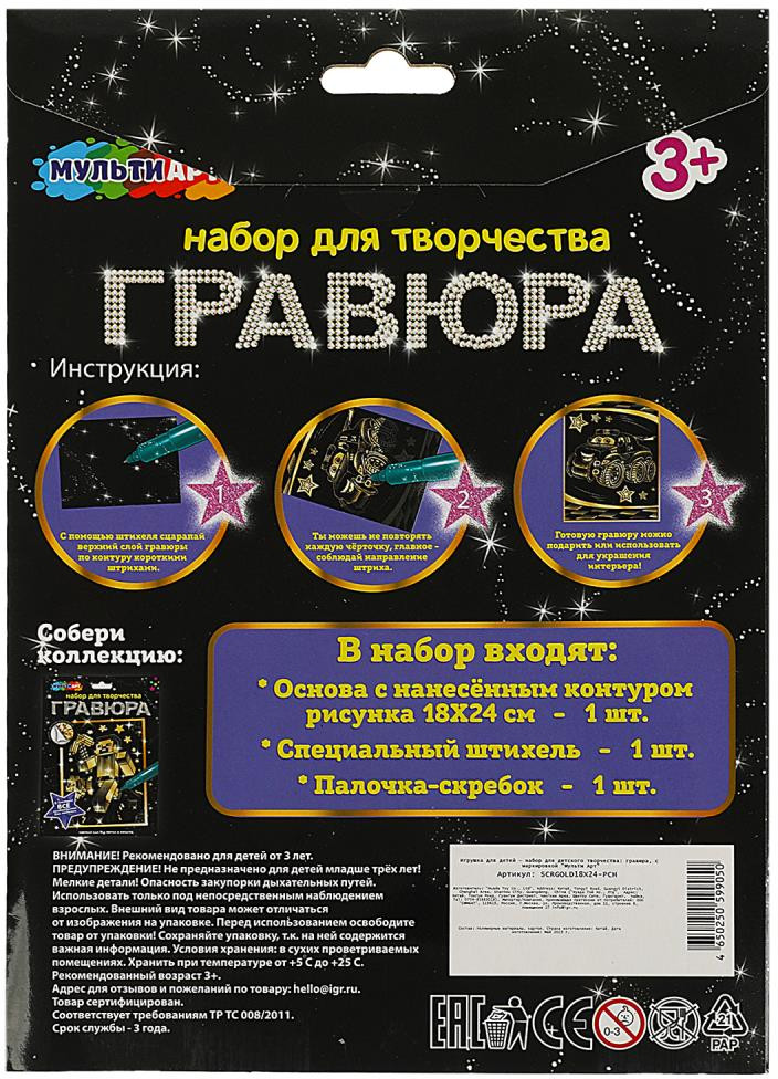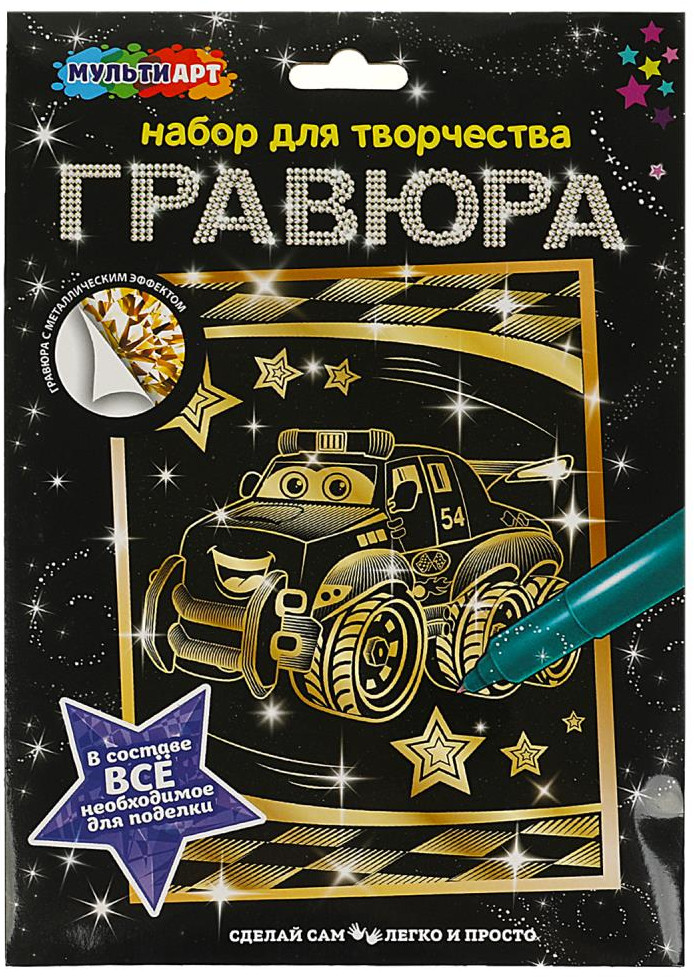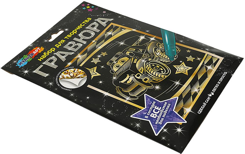 С помощью данного набора юный художник сможет создать эффектную золотистую картину на чёрном фоне. Контур рисунка уже нанесён на основу, остаётся только процарапать изображение специальным штихелем. Можно не повторять каждую черточку, главное — соблюдать направление штриха! Готовая поделка станет отличным вариантом для подарка близким или для украшения интерьера комнаты.
