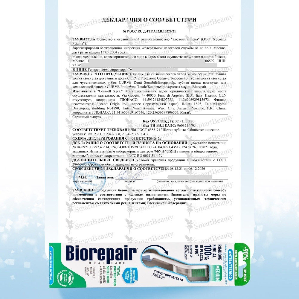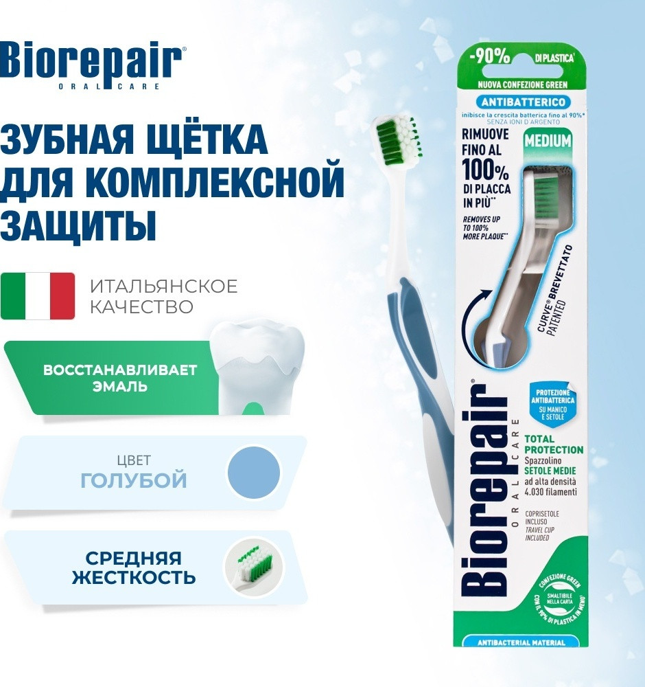 Biorepair Зубная щетка CURVE Protezione Totale+96 удобная ручка ровные щетинки средняя жесткость хорошая ширина с крышечкой