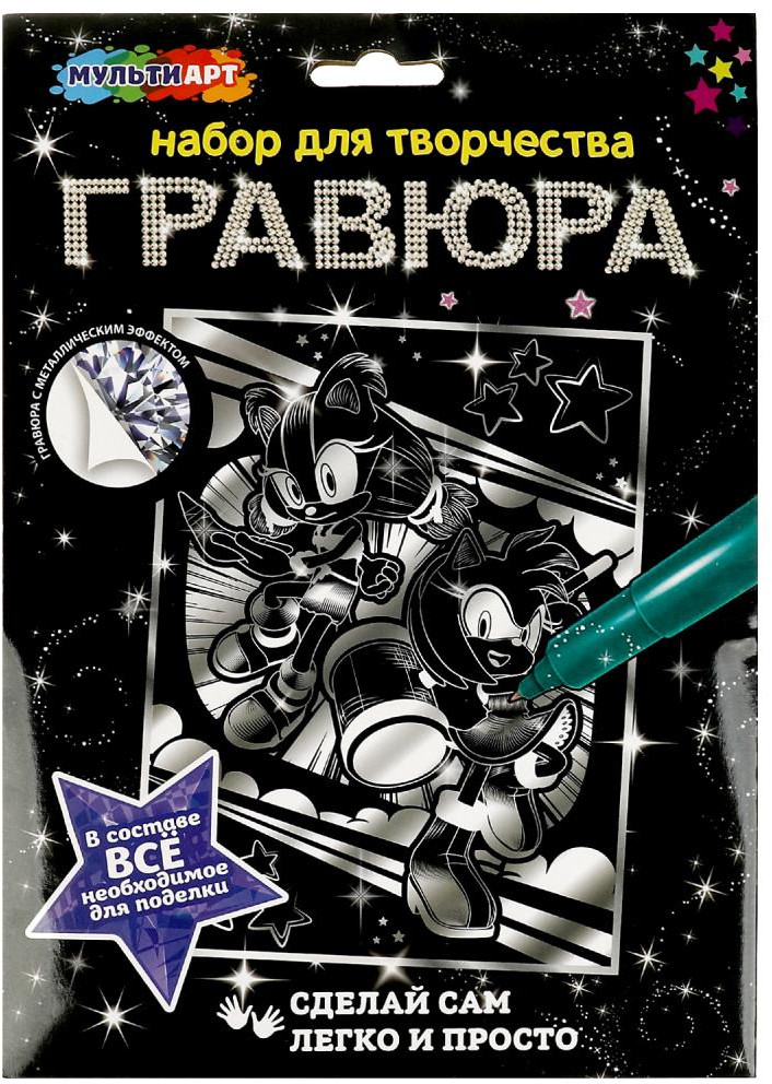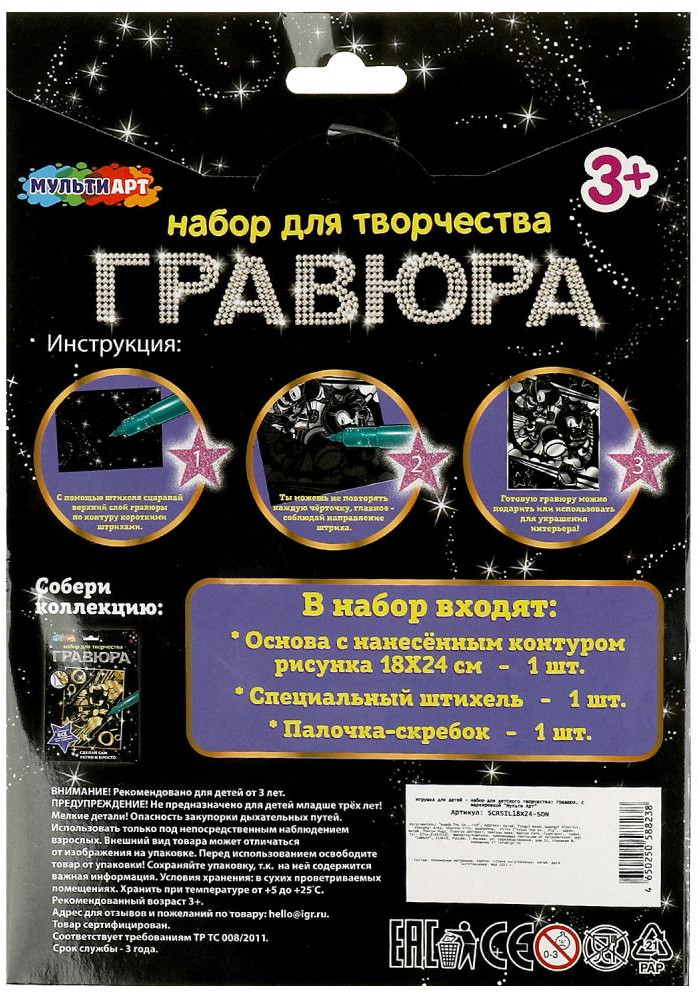 С помощью данного набора юный художник сможет создать эффектную серебристую картину на чёрном фоне. Контур рисунка уже нанесён на основу, остаётся только процарапать изображение специальным штихелем. Можно не повторять каждую черточку, главное — соблюдать направление штриха! Готовая поделка станет отличным вариантом для подарка близким или для украшения интерьера комнаты.