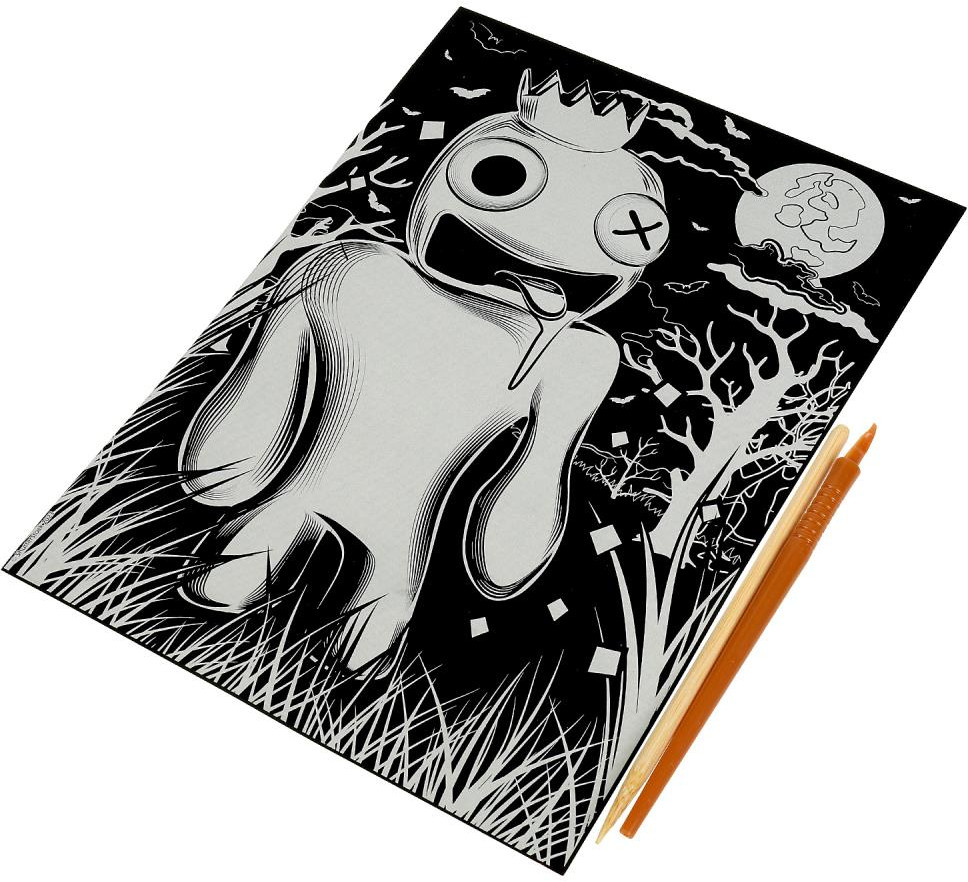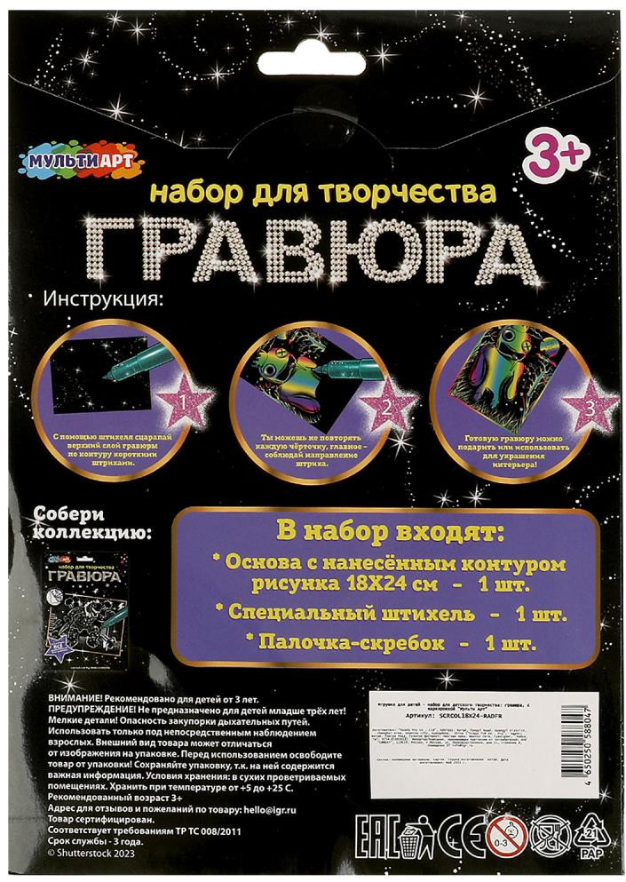 С помощью данного набора юный художник сможет создать эффектную картину на чёрном фоне. Контур рисунка уже нанесён на основу, остаётся только процарапать изображение специальным штихелем. Готовую поделку можно подарить близким или использовать для украшения интерьера.