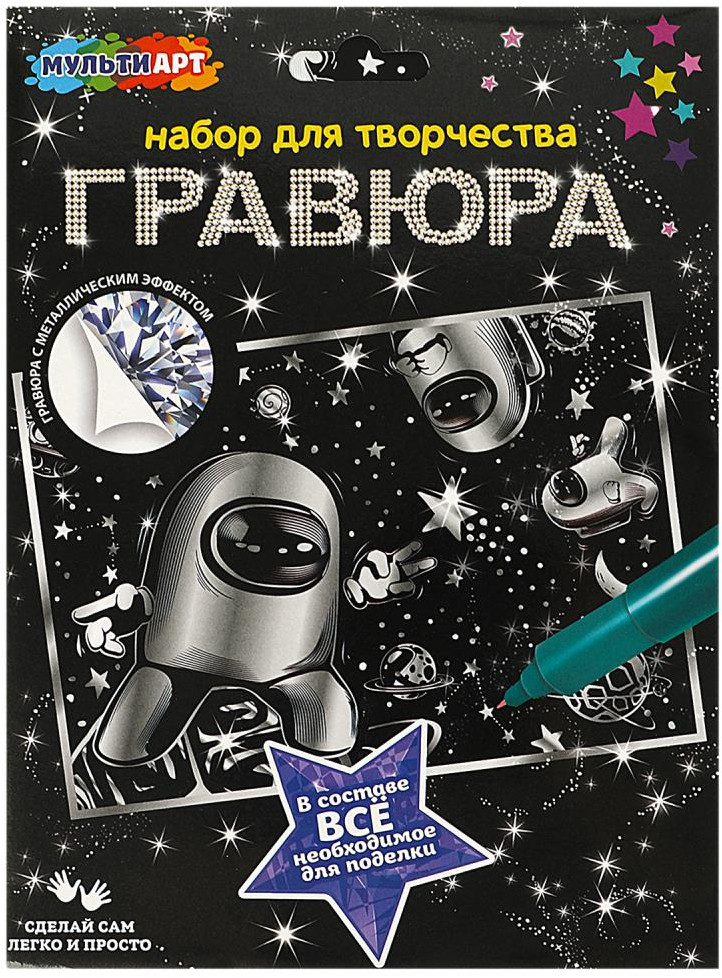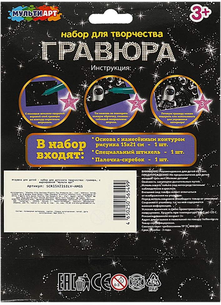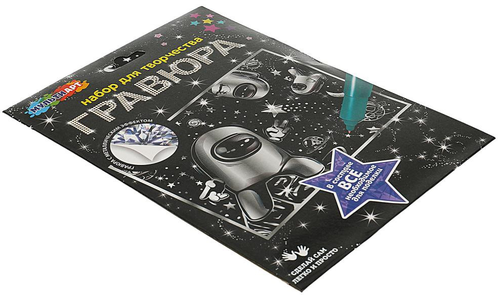 Набор для творчества «Гравюра» ТМ «Мульти Арт» - отличный подарок для ребёнка, который будет способствовать развитию его творческих способностей.С помощью данного набора юный художник сможет создать эффектную серебристую картину на чёрном фоне. Контур рисунка уже нанесён на основу, остаётся только процарапать изображение специальным штихелем. Готовую поделку можно подарить близким или использовать для украшения интерьера.