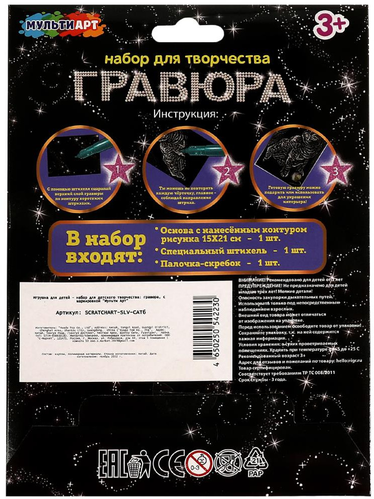 С помощью данного набора юный художник сможет создать эффектную серебряную картину на чёрном фоне. Контур рисунка уже нанесён на основу, остаётся только процарапать изображение специальным штихелем. Готовую поделку можно подарить близким или использовать для украшения интерьера.
