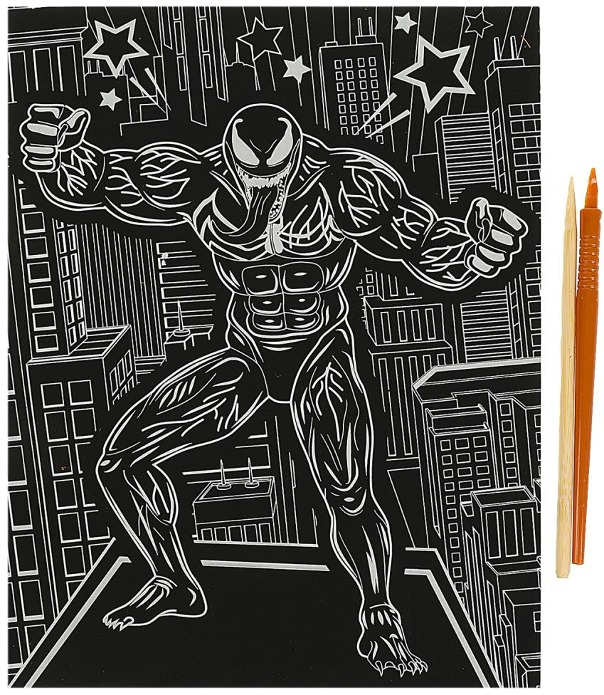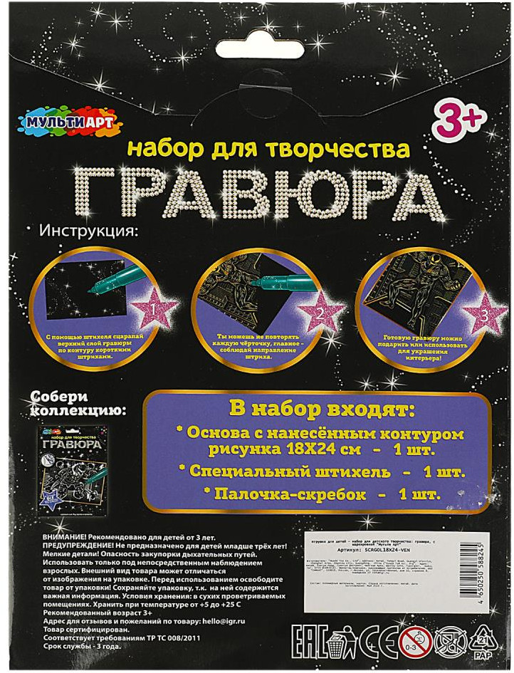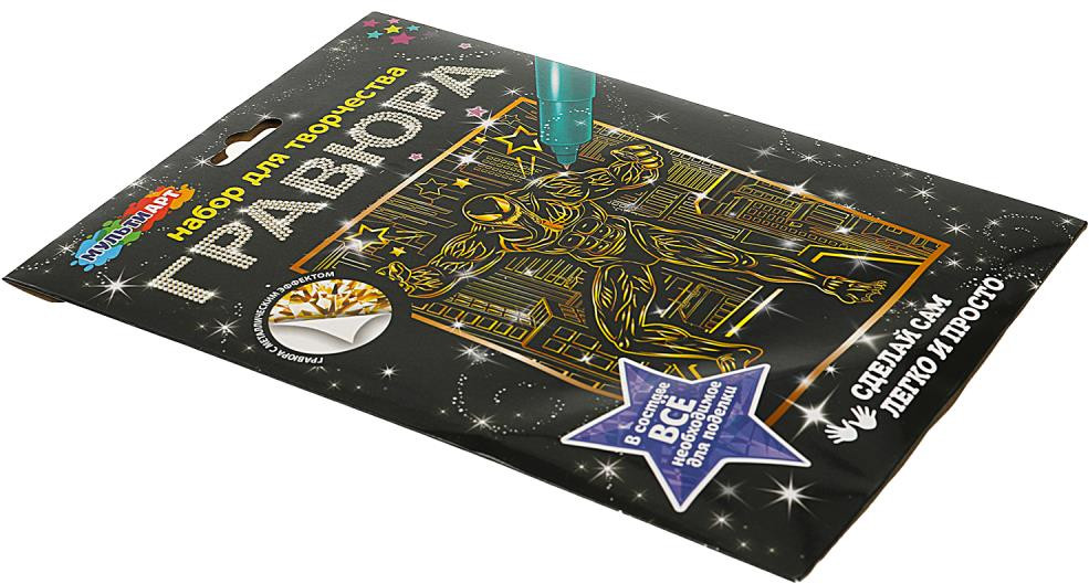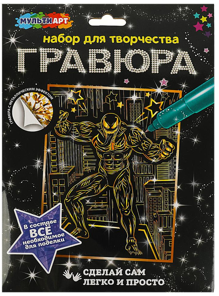 С помощью данного набора юный художник сможет создать эффектную золотистую картину на чёрном фоне. Контур рисунка уже нанесён на основу, остаётся только процарапать изображение специальным штихелем. Можно не повторять каждую черточку, главное — соблюдать направление штриха! Готовая поделка станет отличным вариантом для подарка близким или для украшения интерьера комнаты. Набор для творчества — гравюра «Чёрный герой» ТМ «Мульти Арт» — отличный подарок для ребёнка, который будет способствовать развитию его творческих способностей.