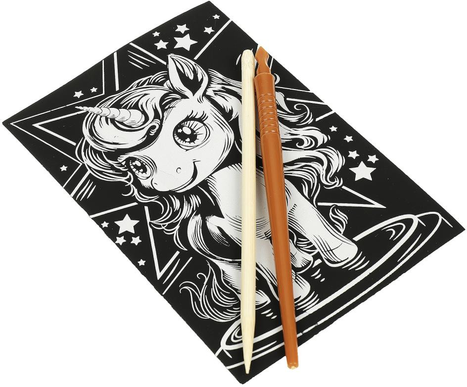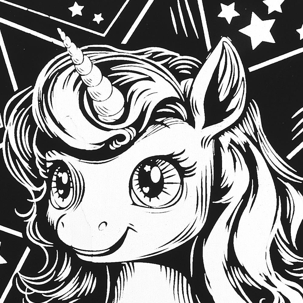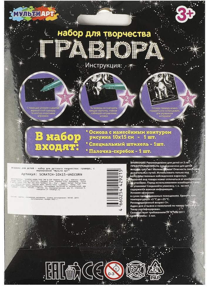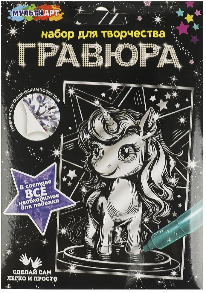 Набор для творчества - гравюра «Единорог» ТМ «Мульти Арт» - отличный подарок для ребёнка, который будет способствовать развитию его творческих способностей.С помощью данного набора юный художник сможет создать эффектную серебристую картину на чёрном фоне. Контур рисунка уже нанесён на основу, остаётся только процарапать изображение специальным штихелем. Можно не повторять каждую черточку, главное - соблюдать направление штриха! Готовая поделка станет отличным вариантом для подарка близким или для украшения интерьера комнаты.