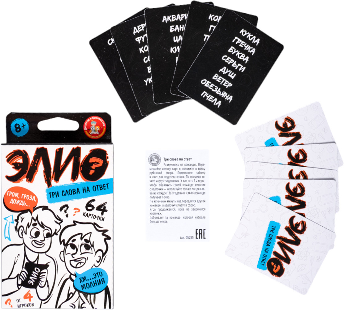 💳 Оплатить за товар можно при получении 🇰🇿 Есть бесплатная доставка по Казахстану 🎁 Копите бонусы с каждой покупки Настольная игра для детей «Элио. Три слова на ответ» — это веселая игра для большой компании от 4 человек. Настольная игра для детей «Элио. Три слова на ответ» развивает логическое мышление, внимательность и словарный запас. |