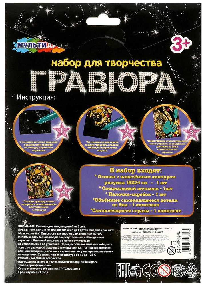 💳 Оплатить за товар можно при получении 🇰🇿 Есть бесплатная доставка по Казахстану от 1 дня 🎁 Копите бонусы с каждой покупки С помощью данного набора маленькая художница сможет создать эффектную картину на чёрном фоне. Контур рисунка уже нанесён на основу чёрного цвета, остаётся только процарапать изображение специальным штихелем. Готовую поделку, дополнительно украшенную деталями из мягкого материала ЭВА и сверкающими стразами, можно подарить близким или использовать для украшения интерьера. Набор для творчества 2 в 1 — гравюра с декорированием «Львёнок» ТМ «Мульти Арт» — отличный подарок для ребёнка, который будет способствовать развитию его творческих способностей. |