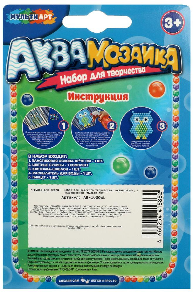 💳 Оплатить за товар можно при получении 🇰🇿 Есть бесплатная доставка по Казахстану от 1 дня 🎁 Копите бонусы с каждой покупки Набор для детского творчества «Аквамозаика. Сова» ТМ «Мульти Арт» - отличный подарок для ребёнка. Собирая эту мозаику, маленький любознайка самостоятельно или с помощью родителей может сложить из разноцветных бусин фигурку забавной совушки. Чтобы зафиксировать рисунок, бусины необходимо смочить водой, после чего они застынут, и фигурку можно будет использовать для дальнейшей игры. |