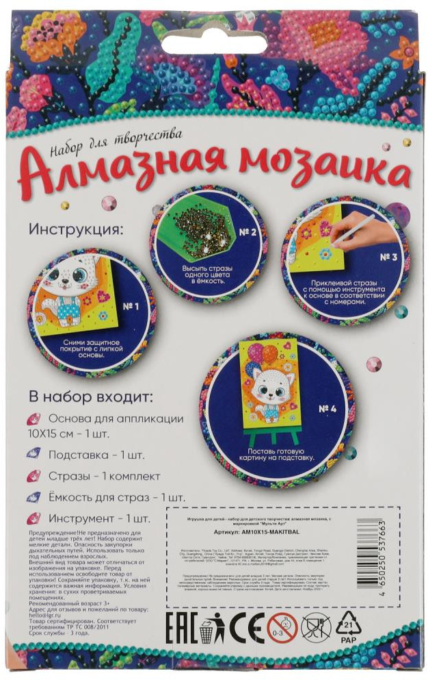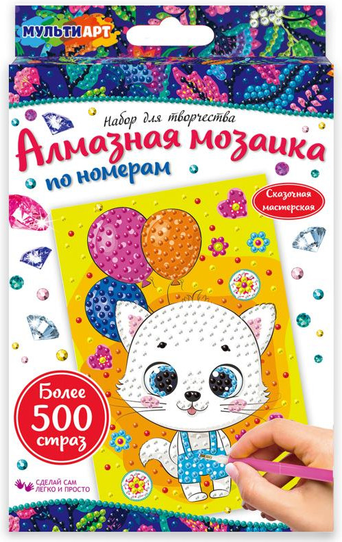 💳 Оплатить за товар можно при получении 🇰🇿 Есть бесплатная доставка по Казахстану 🎁 Копите бонусы с каждой покупки Набор для детского творчества — алмазная мозаика «Котик с шариками» — отличный подарок для ребёнка, который будет способствовать развитию его творческих способностей. При помощи этого набора маленький художник сможет создать красивую картинку-мозаику, декорированную сверкающими стразами. Яркую блестящую поделку можно подарить близким или использовать для украшения комнаты. Творческие занятия с алмазной мозаикой ТМ «Мульти Арт» обладают успокаивающим действием, а также развивают: творческое мышление, цветовое восприятие, усидчивость, внимание, аккуратность. |
