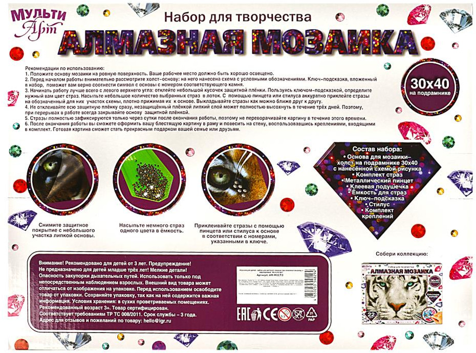 💳 Оплатить за товар можно при получении 🇰🇿 Есть бесплатная доставка по Казахстану 🎁 Копите бонусы с каждой покупки Набор для детского творчества — алмазная мозаика «Тигр» ТМ «Мульти Арт» — отличный подарок для ребёнка, который будет способствовать развитию его творческих способностей. При помощи этого набора маленький художник сможет создать красивую картинку-мозаику, декорированную сверкающими стразами. Яркую блестящую поделку можно подарить близким или использовать для украшения комнаты. Творческие занятия с алмазной мозаикой ТМ «Мульти Арт» обладают успокаивающим действием, а также развивают: творческое мышление, цветовое восприятие, усидчивость, внимание, аккуратность. |