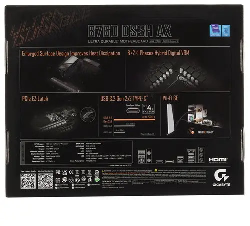 В GIGABYTE B760 DS3H AX реализованы сетевой коннектор 1 Гбит/с и интегрированный адаптер беспроводной связи, что позволяет подключаться к Wi-Fi и устройствам беспроводным способом. Кнопка Q-Flash Plus предусматривает обновление прошивки в системе BIOS. Элементная база Ultra Durable гарантирует стабильность в эксплуатации платы.