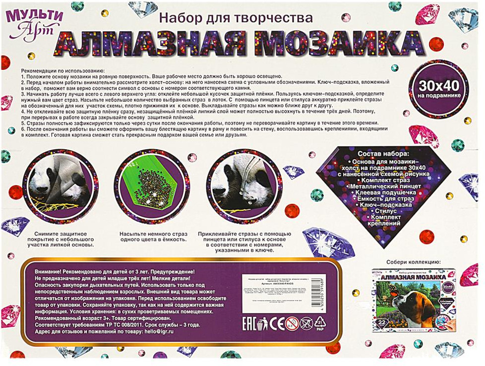 💳 Оплатить за товар можно при получении 🇰🇿 Есть бесплатная доставка по Казахстану 🎁 Копите бонусы с каждой покупки Набор для детского творчества — алмазная мозаика «Панды» ТМ «Мульти Арт» — отличный подарок для ребёнка, который будет способствовать развитию его творческих способностей. При помощи этого набора маленький художник сможет создать красивую картинку-мозаику, декорированную сверкающими стразами. Яркую блестящую поделку можно подарить близким или использовать для украшения комнаты. Творческие занятия с алмазной мозаикой ТМ «Мульти Арт» обладают успокаивающим действием, а также развивают: творческое мышление, цветовое восприятие, усидчивость, внимание, аккуратность. |