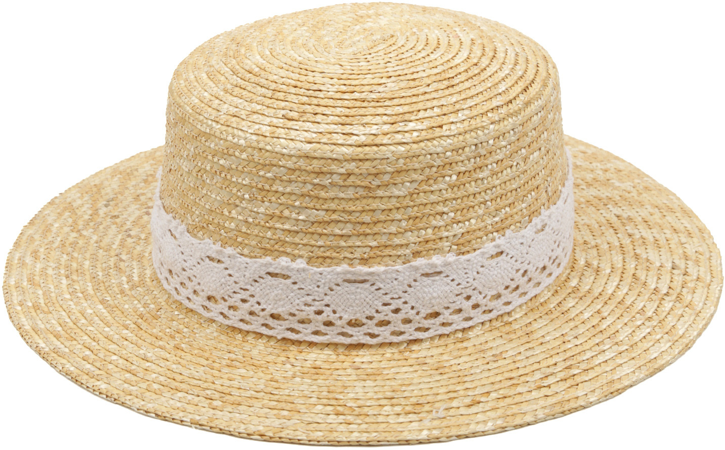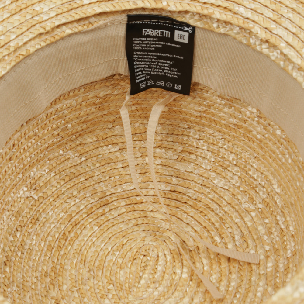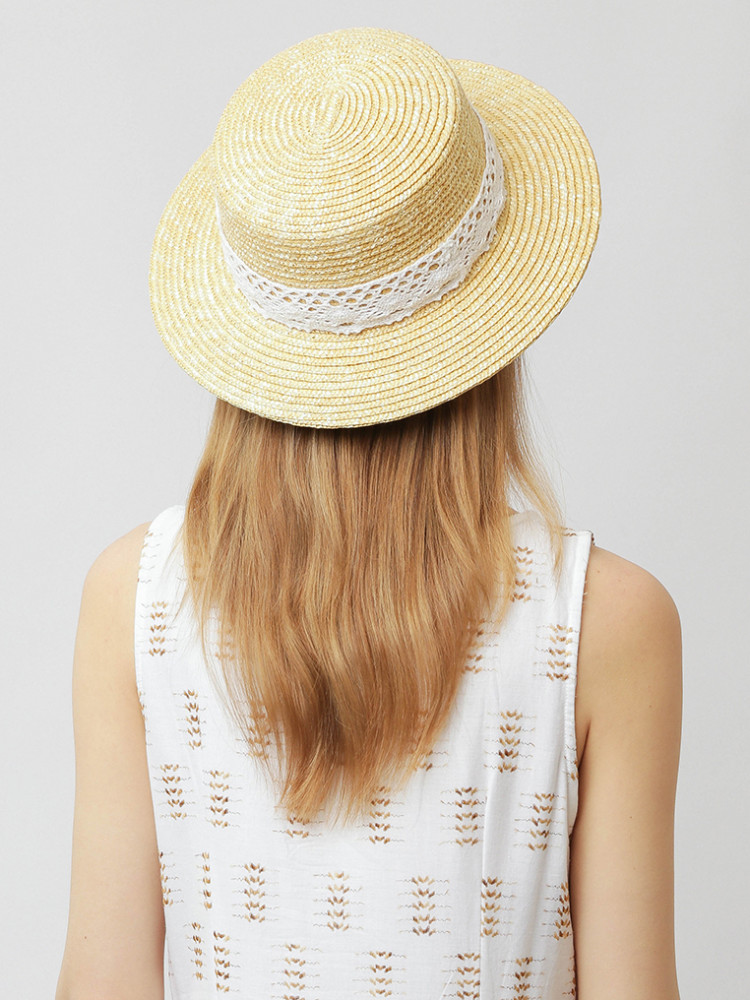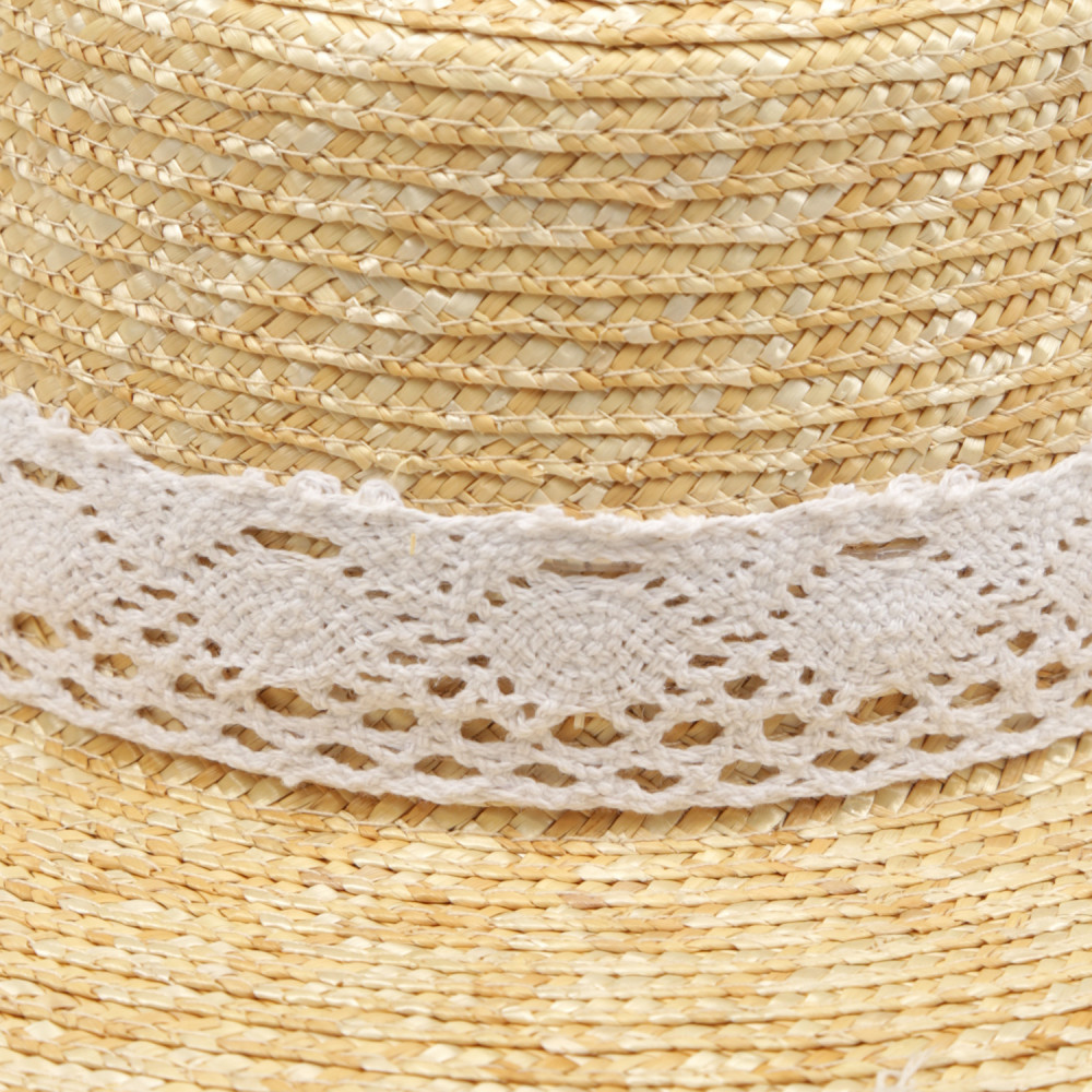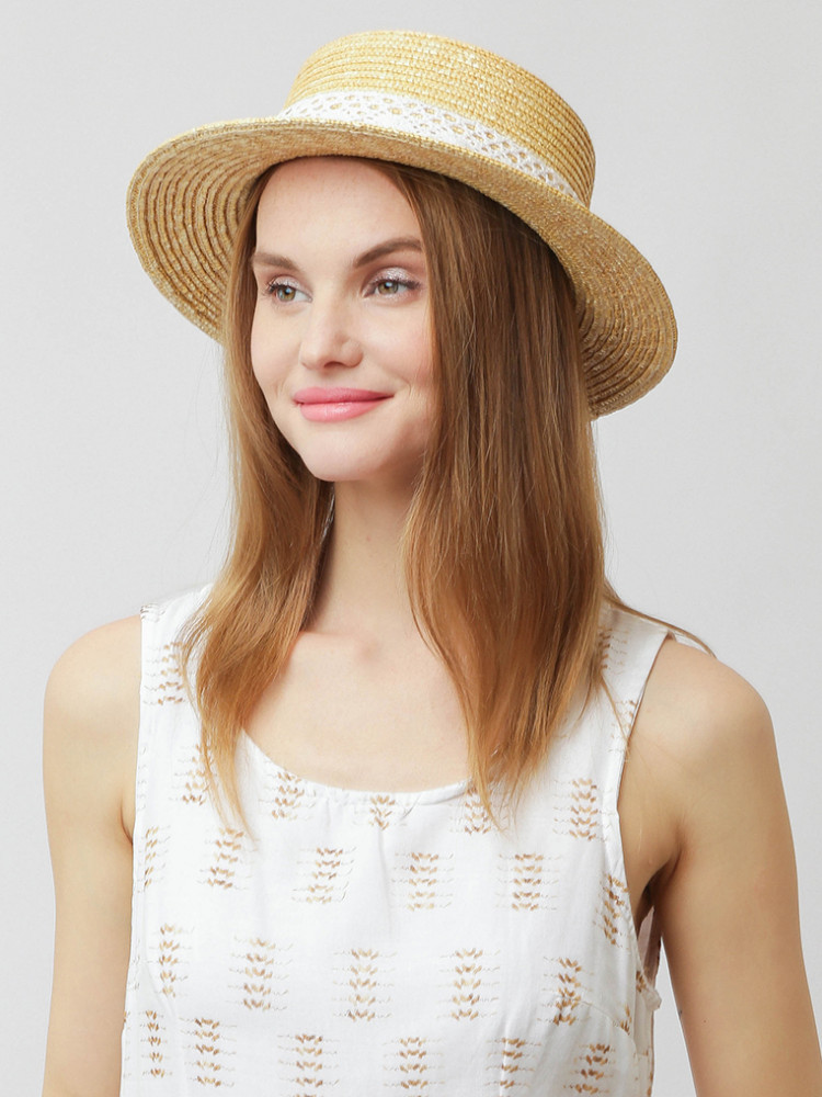 Стильная шляпа канотье в бежевом оттенке выполнена из собранной вручную и хорошо просушенной натуральной соломки — экологичного материала премиального качества. В такой шляпе будет комфортно даже в самый знойный полдень. Тулья украшена ажурной хлопковой тесьмой в белом цвете. Ровные поля выгодно подчеркивают черты лица. Размер шляпы регулируется с помощью внутренней утягивающей ленты. Общий диаметр — 34 см, высота — 10 см.